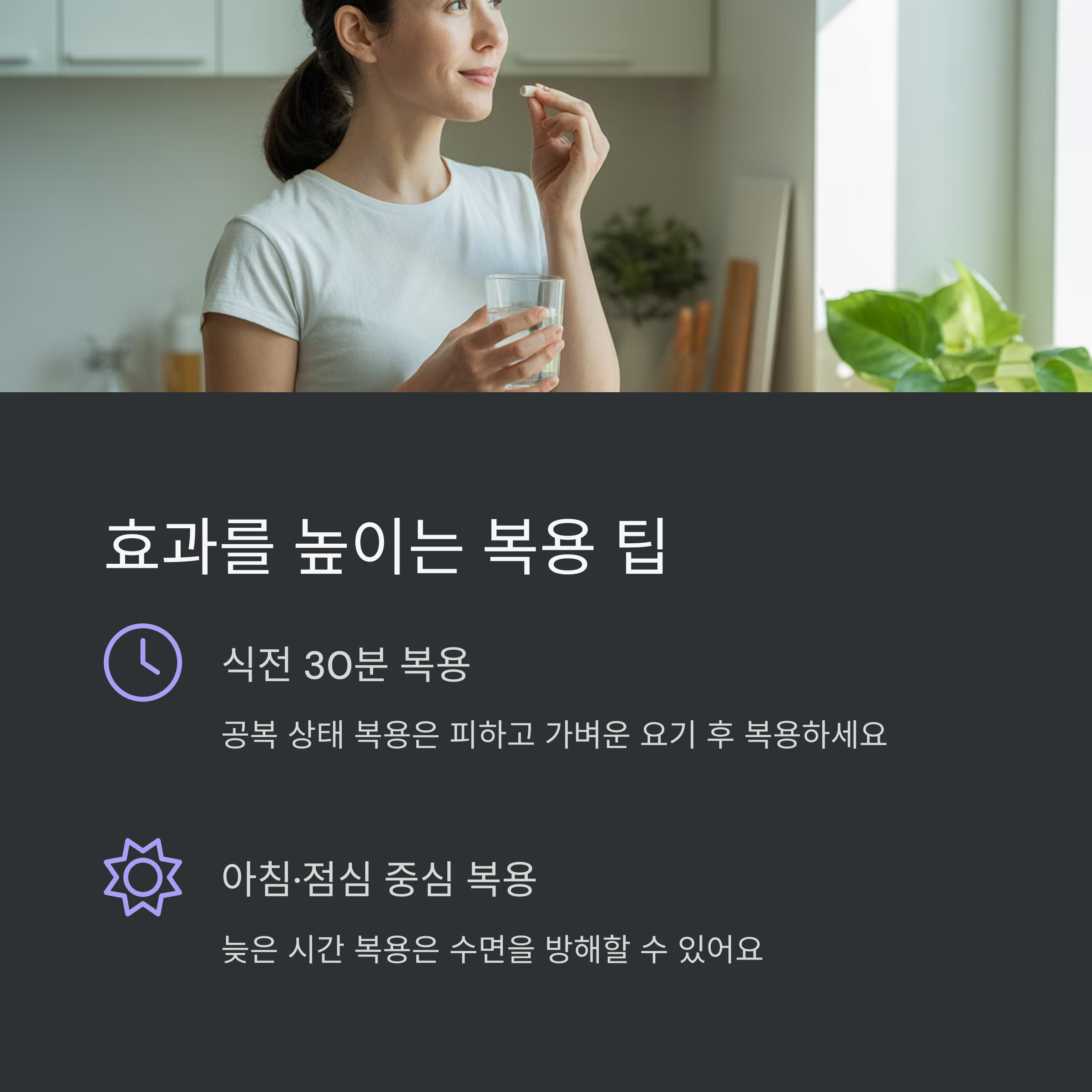 위장에 부담이 갈 수 있으므로 식전 30분 정도에 가벼운 요기 후 복용 추천 - 저녁보다는 아침·점심 중심 복용