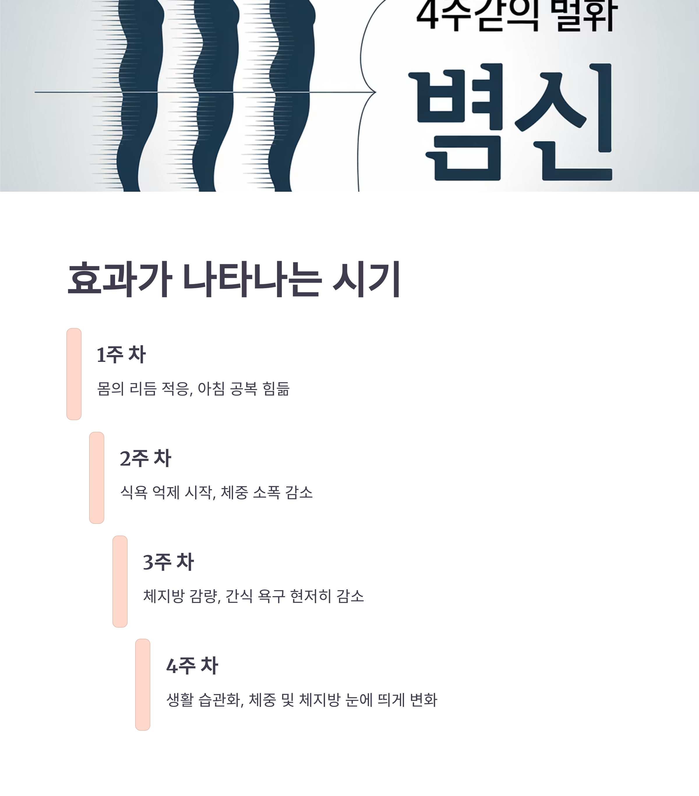 | 2주 차 | 식욕 억제 시작, 체중 소폭 감소 |