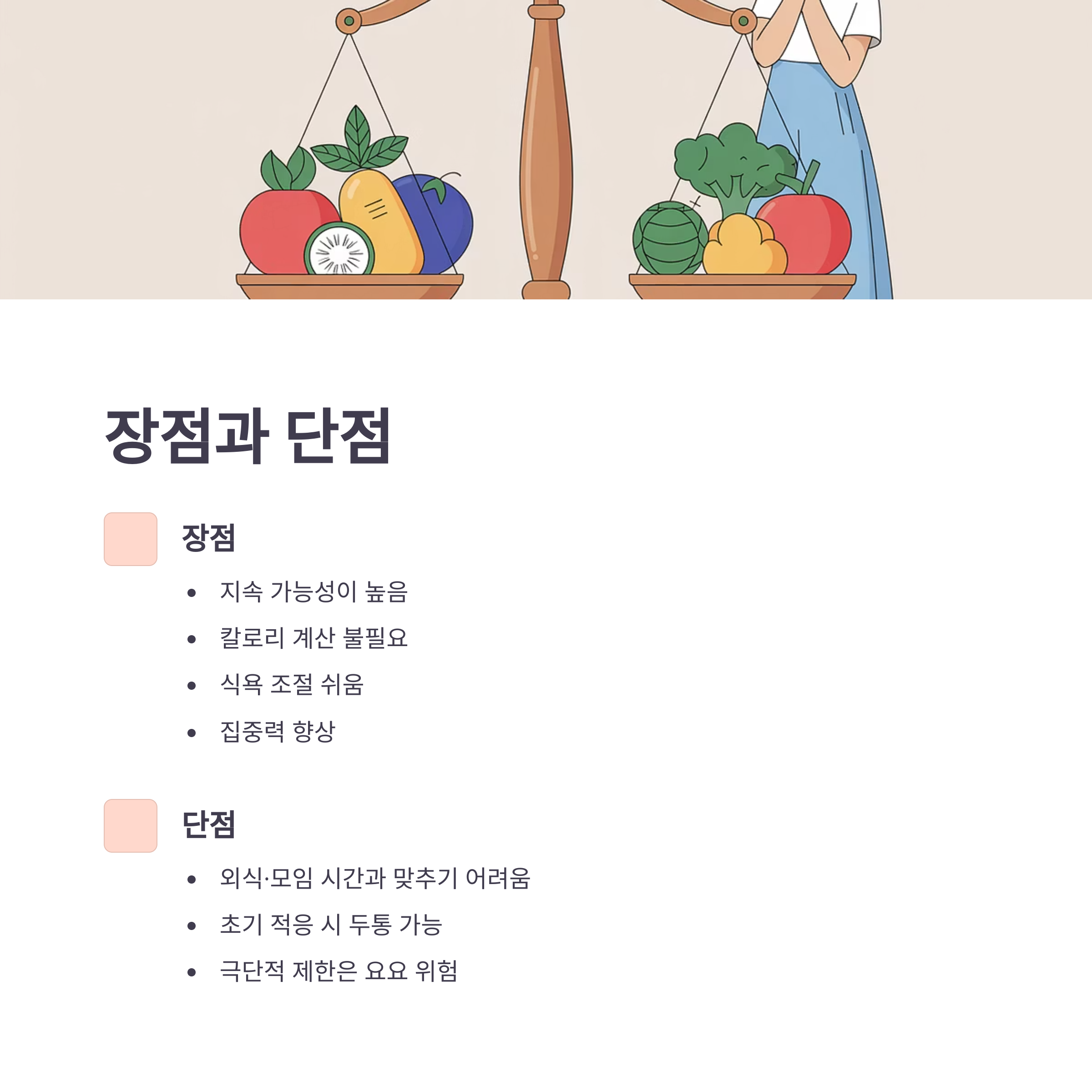 | 식사 시간 제한 | 식욕 조절 쉬움, 과식 방지 가능 | 외식·모임 시간과 맞추기 어려움 |