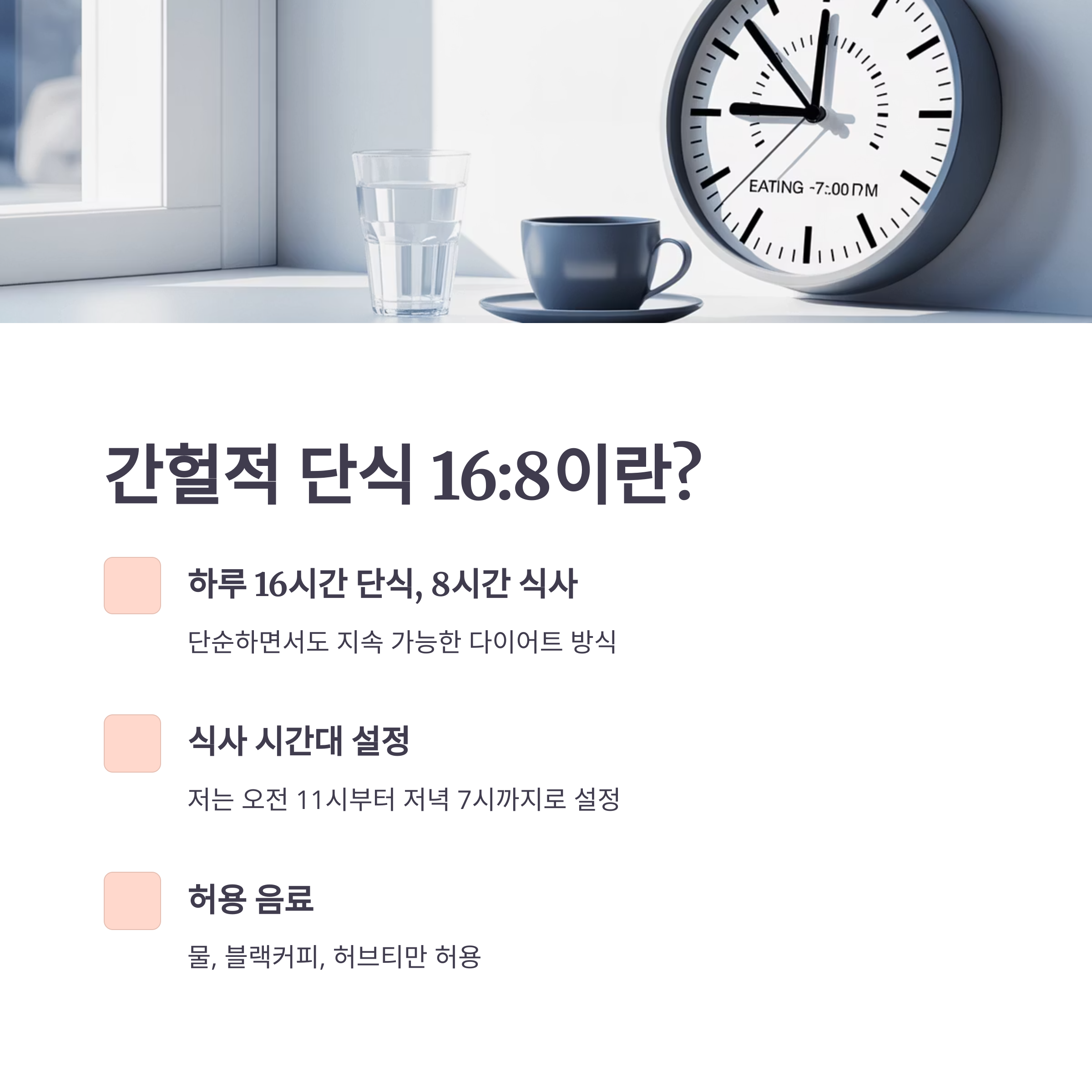 간헐적 단식 16:8은 특별한 준비 없이도 누구나 도전할 수 있는 다이어트 방식입니다. 저의 경우 운동 없이 오직 식사 시간 조절만으로도 체중 감량과 식습관 개선이라는 두 가지 성과를 모두 얻을 수 있었습니다. 무엇보다 ‘음식에 휘둘리지 않고, 스스로를 조절할 수 있다’는 자신감이 생긴 것이 가장 큰 변화였습니다.