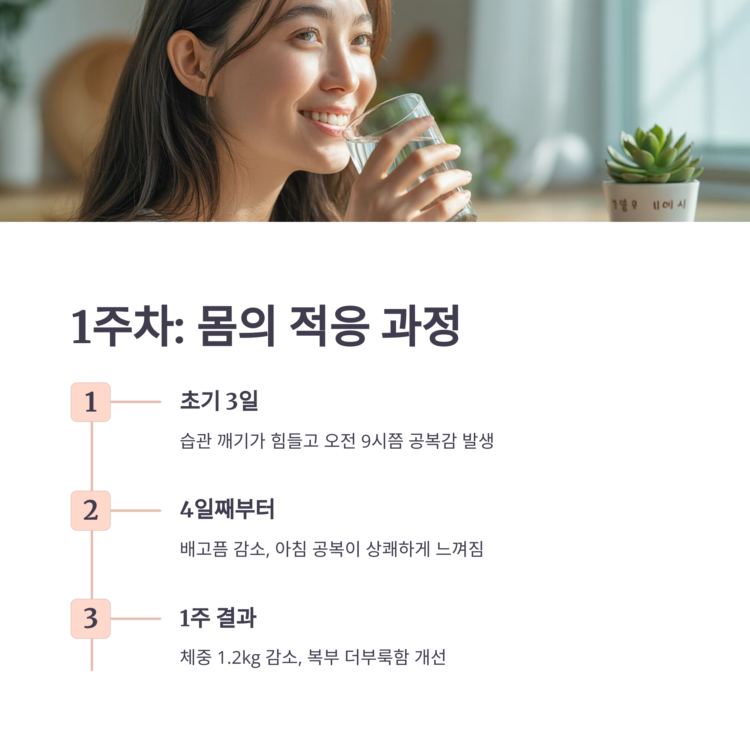 4일째부터는 신기하게도 배고픔이 줄어들었습니다. 아침에 공복이 오히려 상쾌하게 느껴지고, 집중력이 좋아졌다는 점도 인상 깊었습니다. 몸이 새로운 리듬에 적응하기 시작한 느낌이었죠.