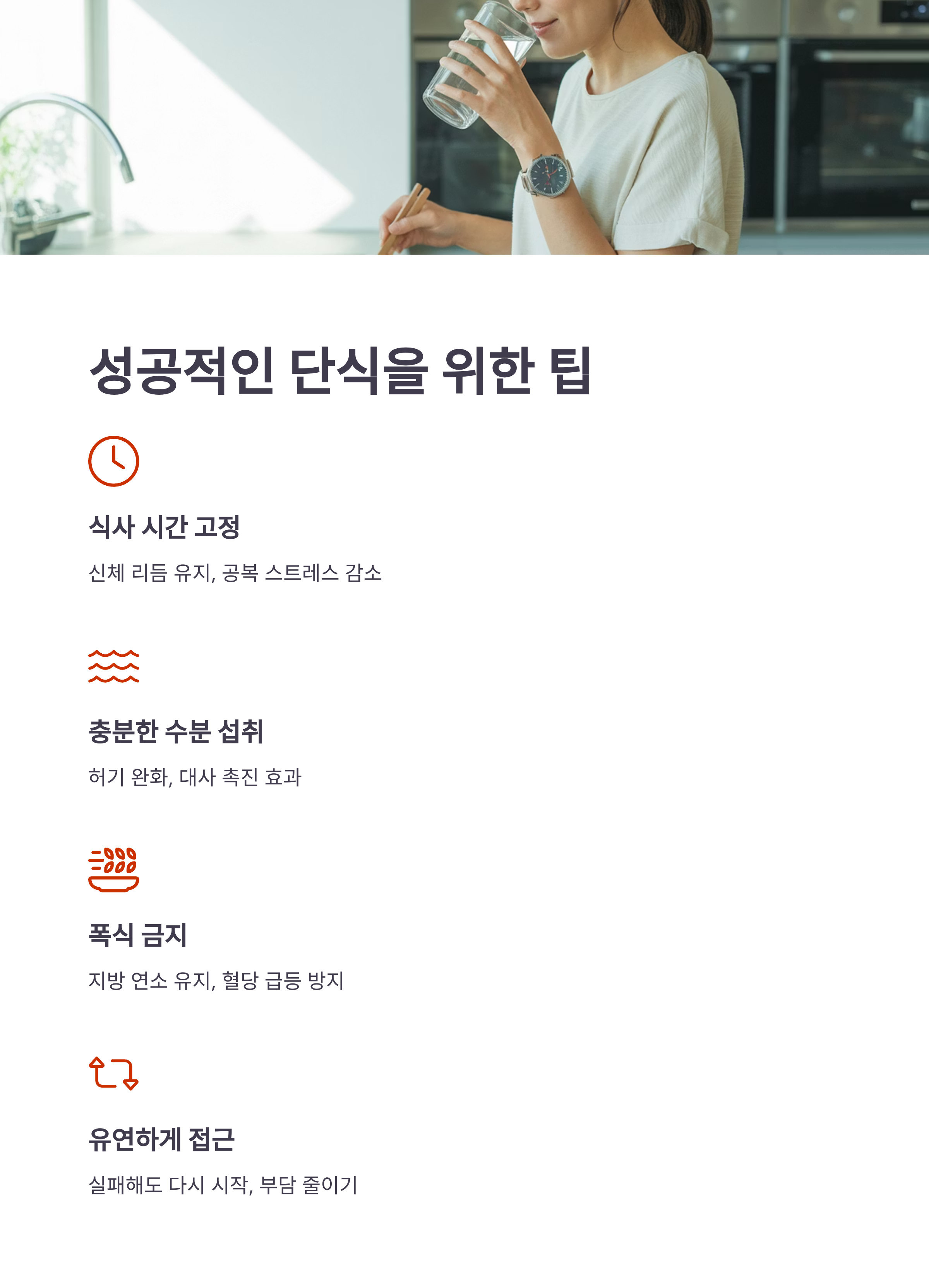 성공적인 간헐적 단식을 위해 중요한 것은 무리하지 않는 계획과 유연한 습관화입니다. 아래의 팁은 실천에 많은 도움이 되었습니다.