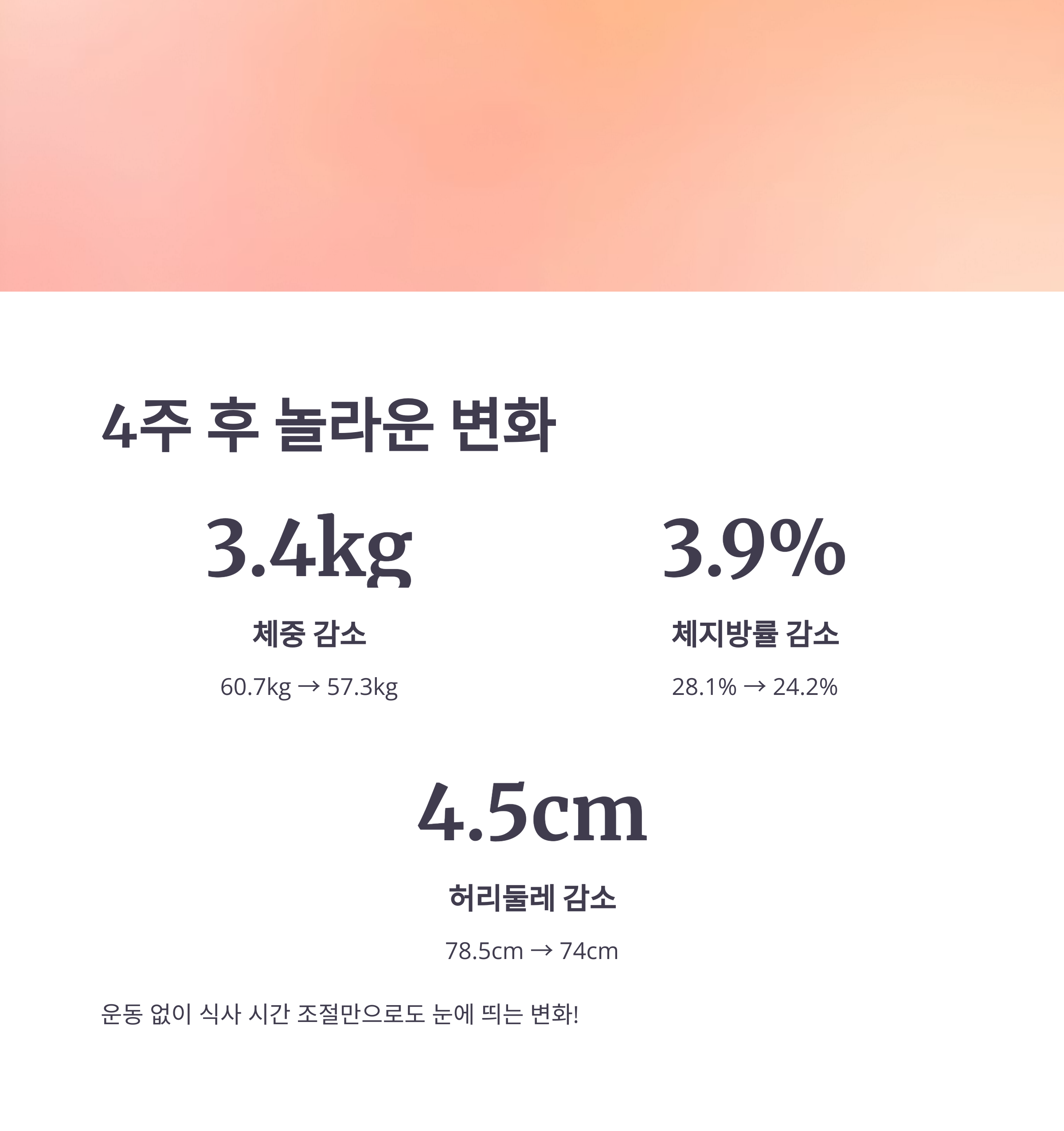 간헐적 단식을 4주 동안 유지한 결과, 체중은 총 3.4kg 감소했습니다. 특히 체지방이 줄어들고 허리둘레가 눈에 띄게 줄었습니다. 중요한 건, 전혀 억지로 하지 않았다는 점입니다. 식사 시간에 배고픔을 해결하되, 과식만 피하는 수준이었고, 따로 운동을 하지 않아도 감량이 가능했습니다.