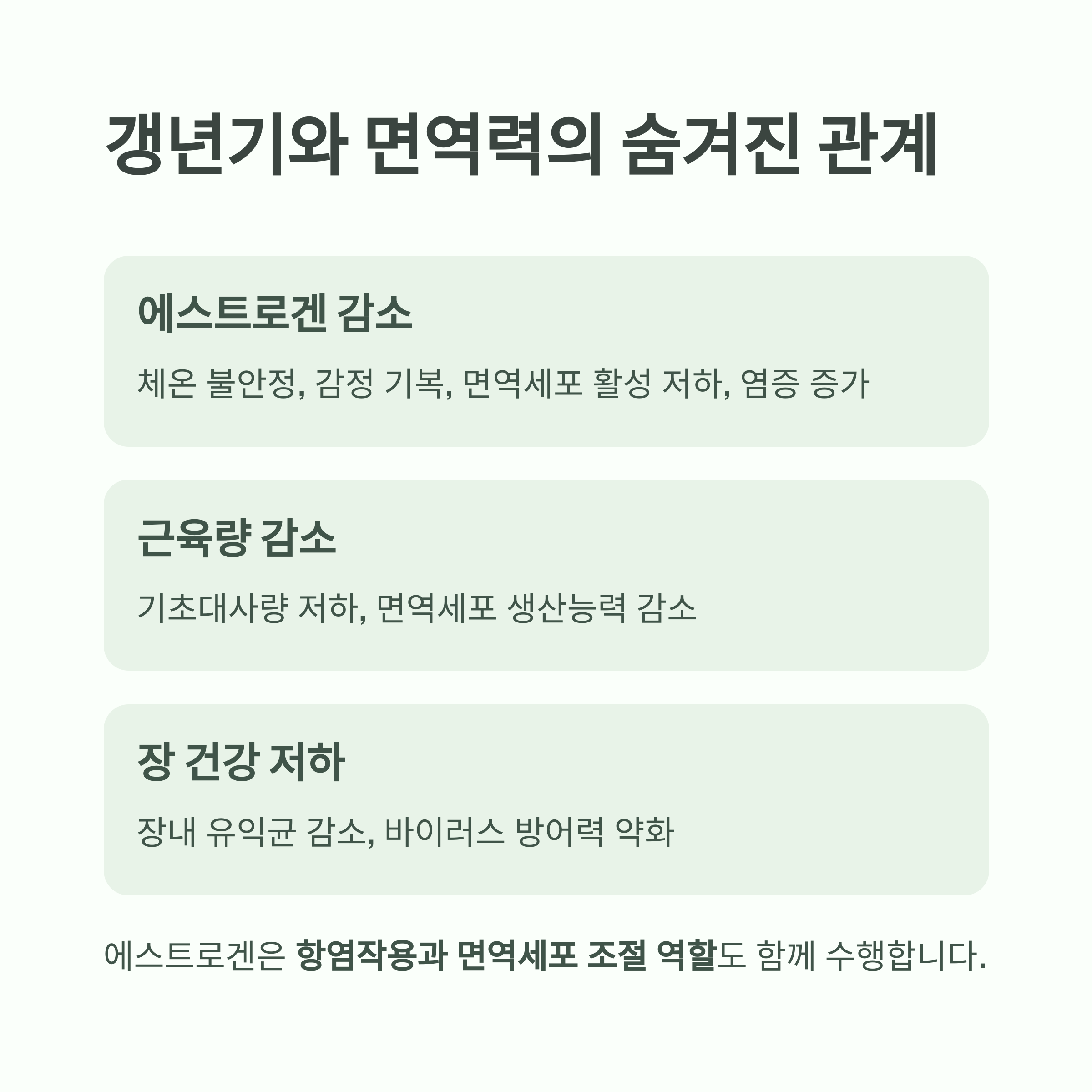 | 에스트로겐 감소 | 체온 불안정, 감정 기복 | 면역세포 활성 저하, 염증 증가 |