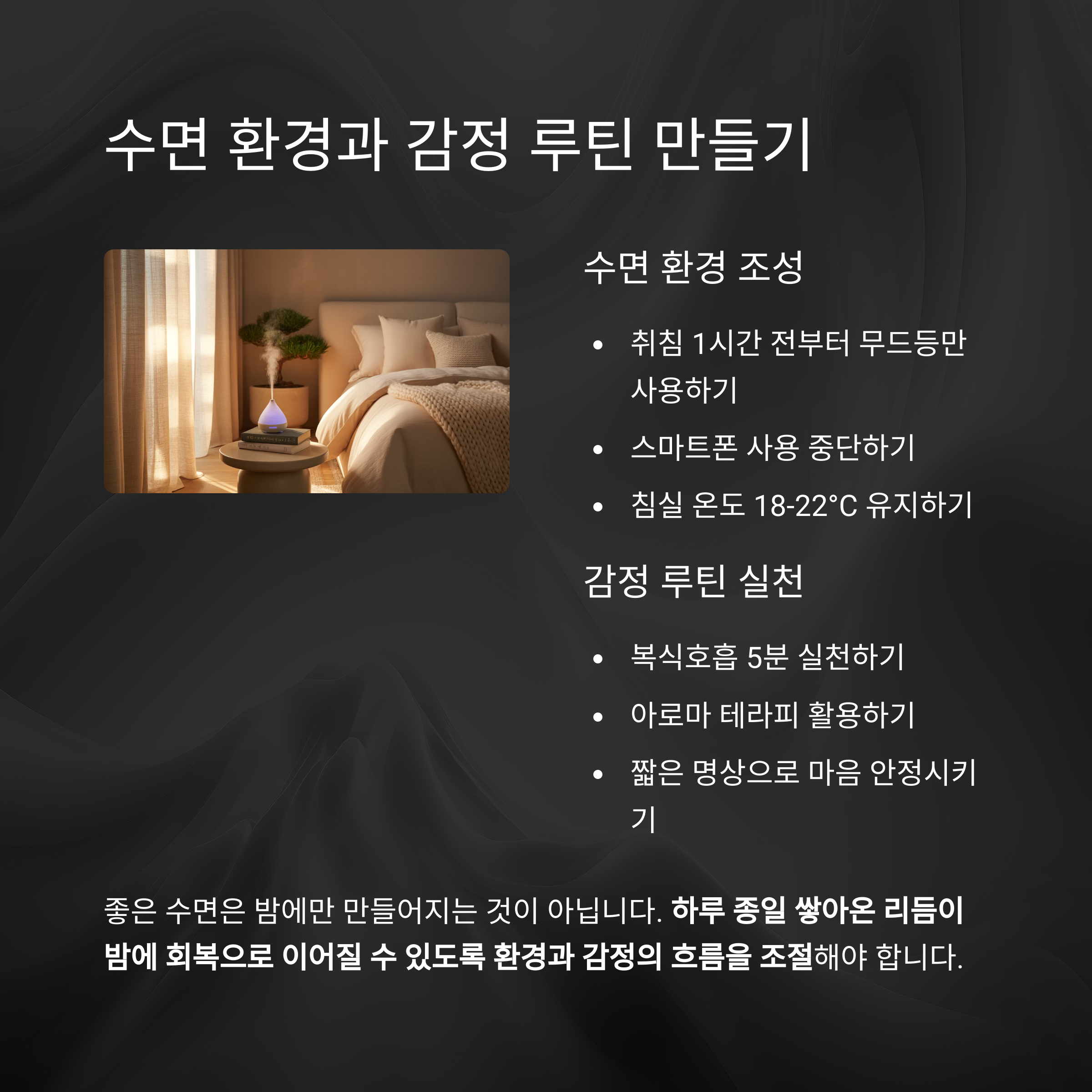 | 수면 조명 | 취침 1시간 전부터 무드등만 사용 | 교감신경 억제, 뇌파 안정화 |