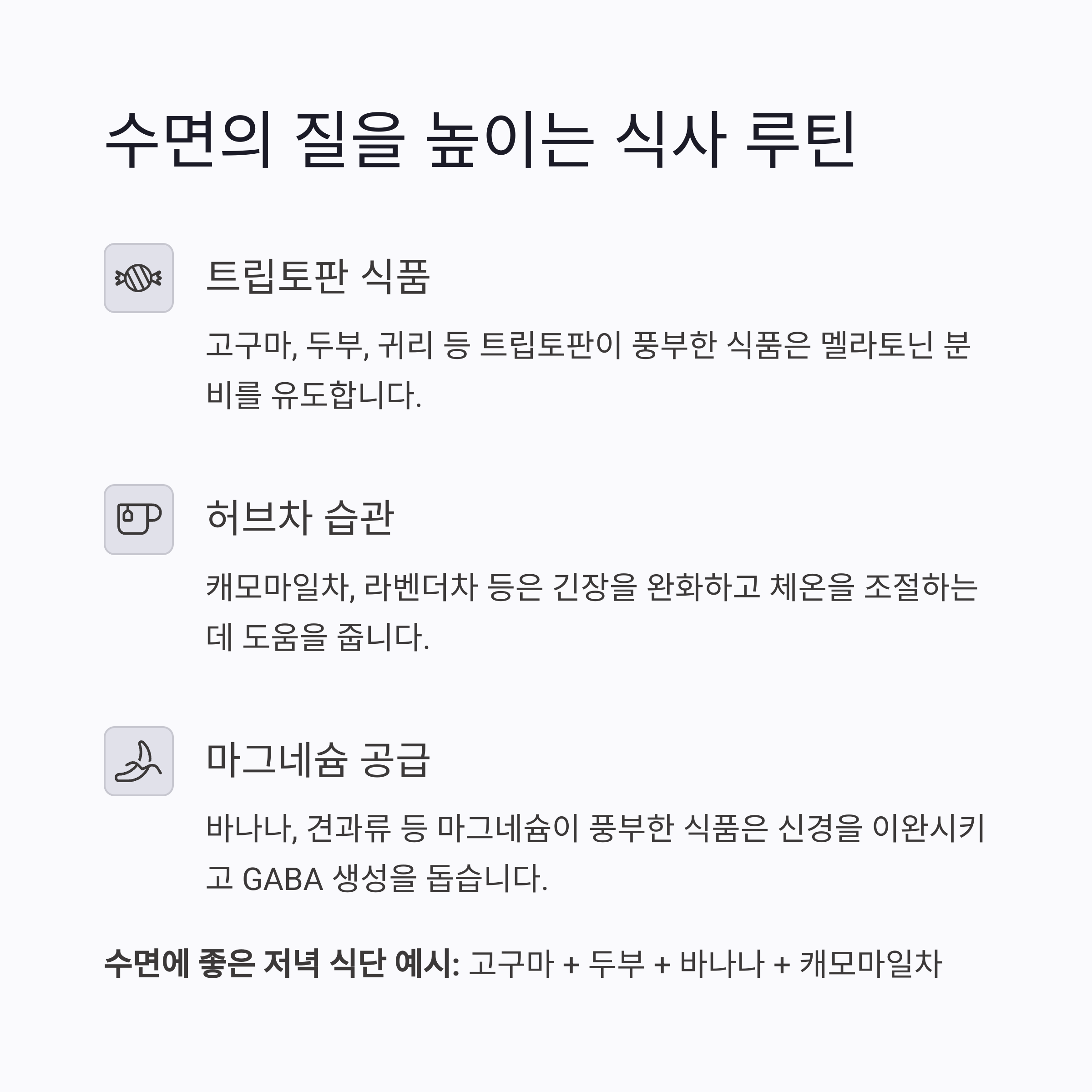| 저녁 식사 | 고구마, 두부, 귀리 등 트립토판 포함 | 멜라토닌 분비 유도 |