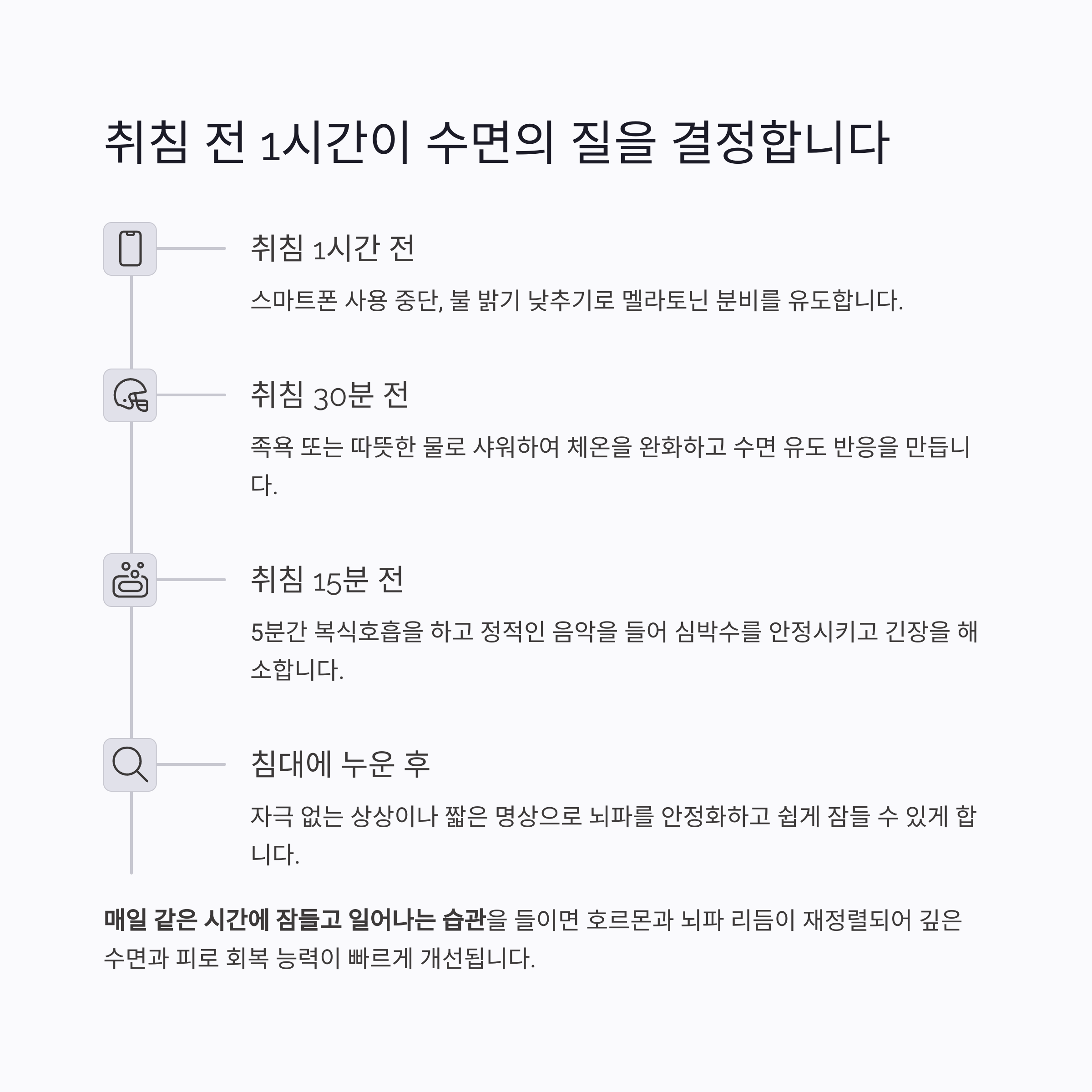 | 취침 1시간 전 | 스마트폰 중단, 불 밝기 낮추기 | 멜라토닌 분비 유도 |