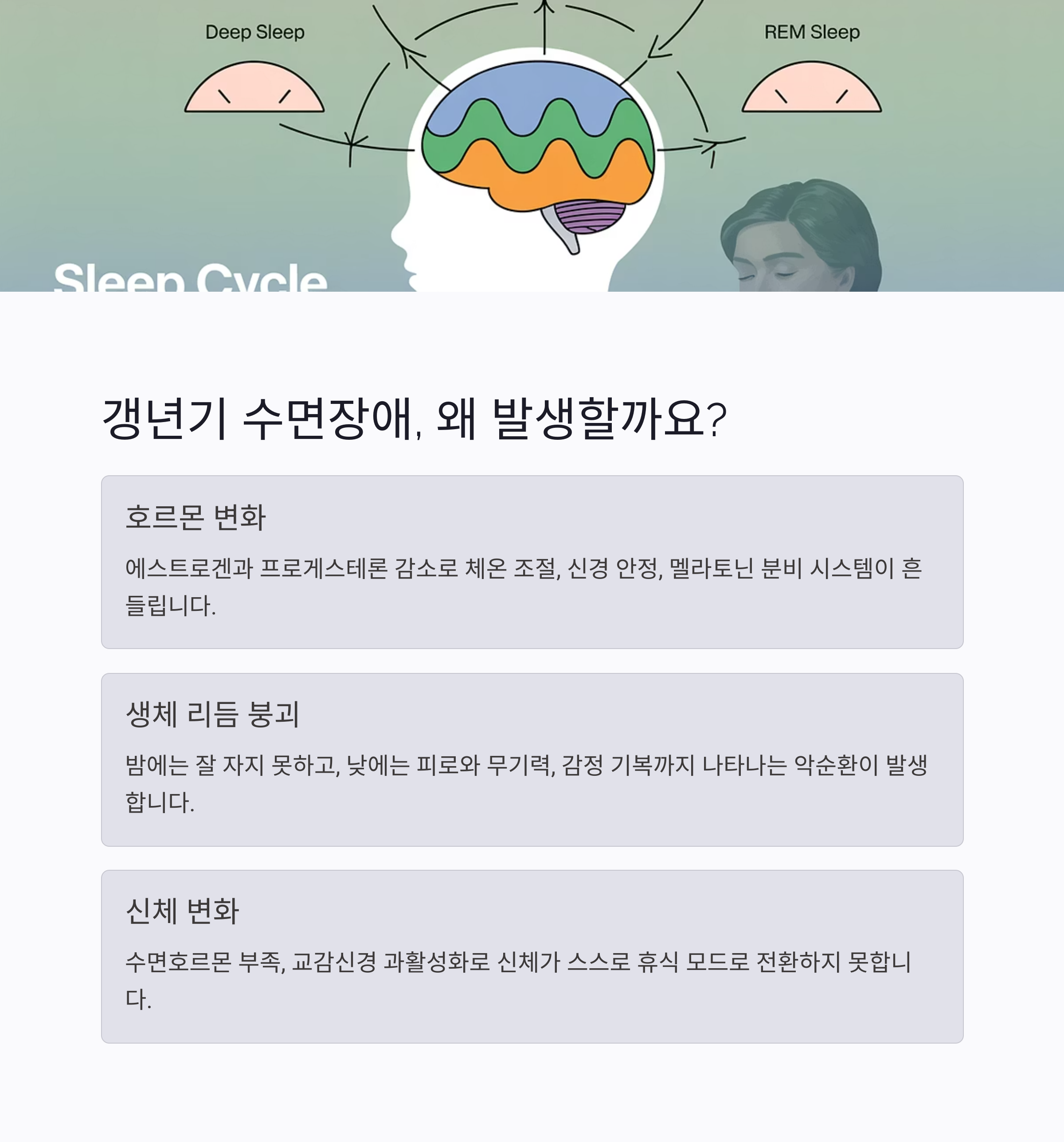 | 에스트로겐 감소 | 체온 조절 이상, 각성 증가 | 자주 깸, 안면홍조로 인한 각성 |