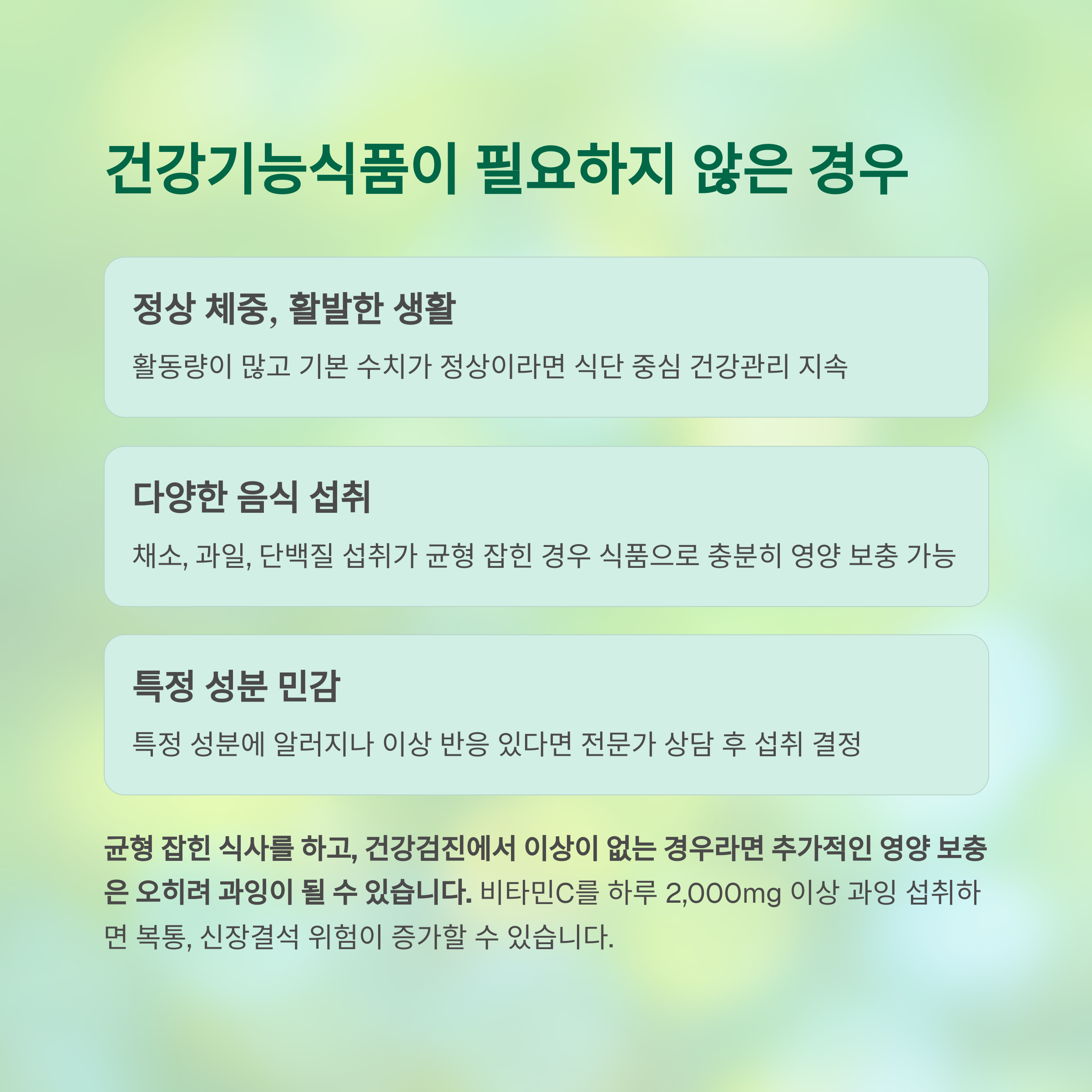 | 개인 상태 고려 | 질환, 복용약과의 상호작용 유의 | 의사 상담 또는 영양사 권고 |