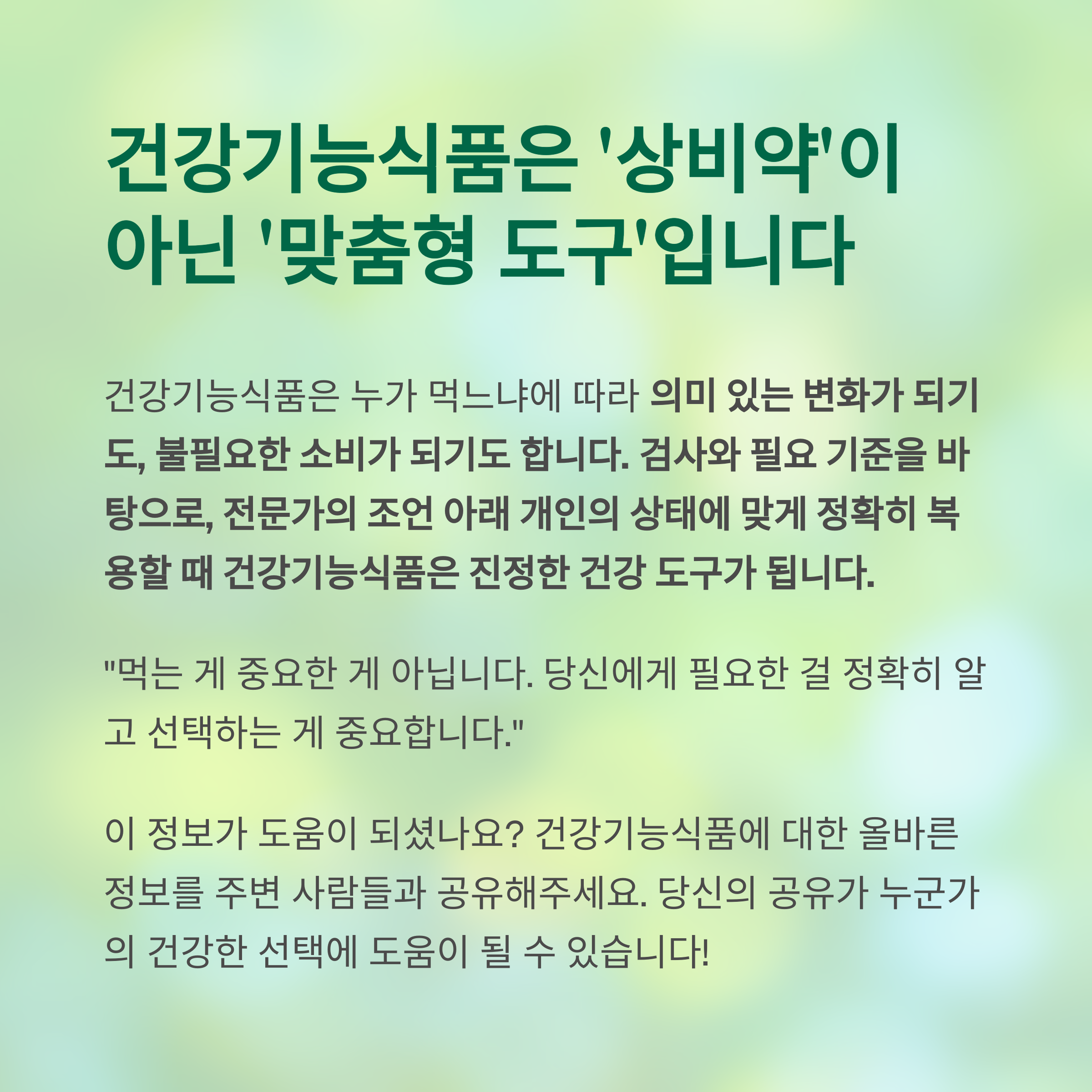 → 건강기능식품은 '치료제'가 아닌 '보조제'입니다. 상시 복용보다는 주기적 점검과 조절이 필요합니다
