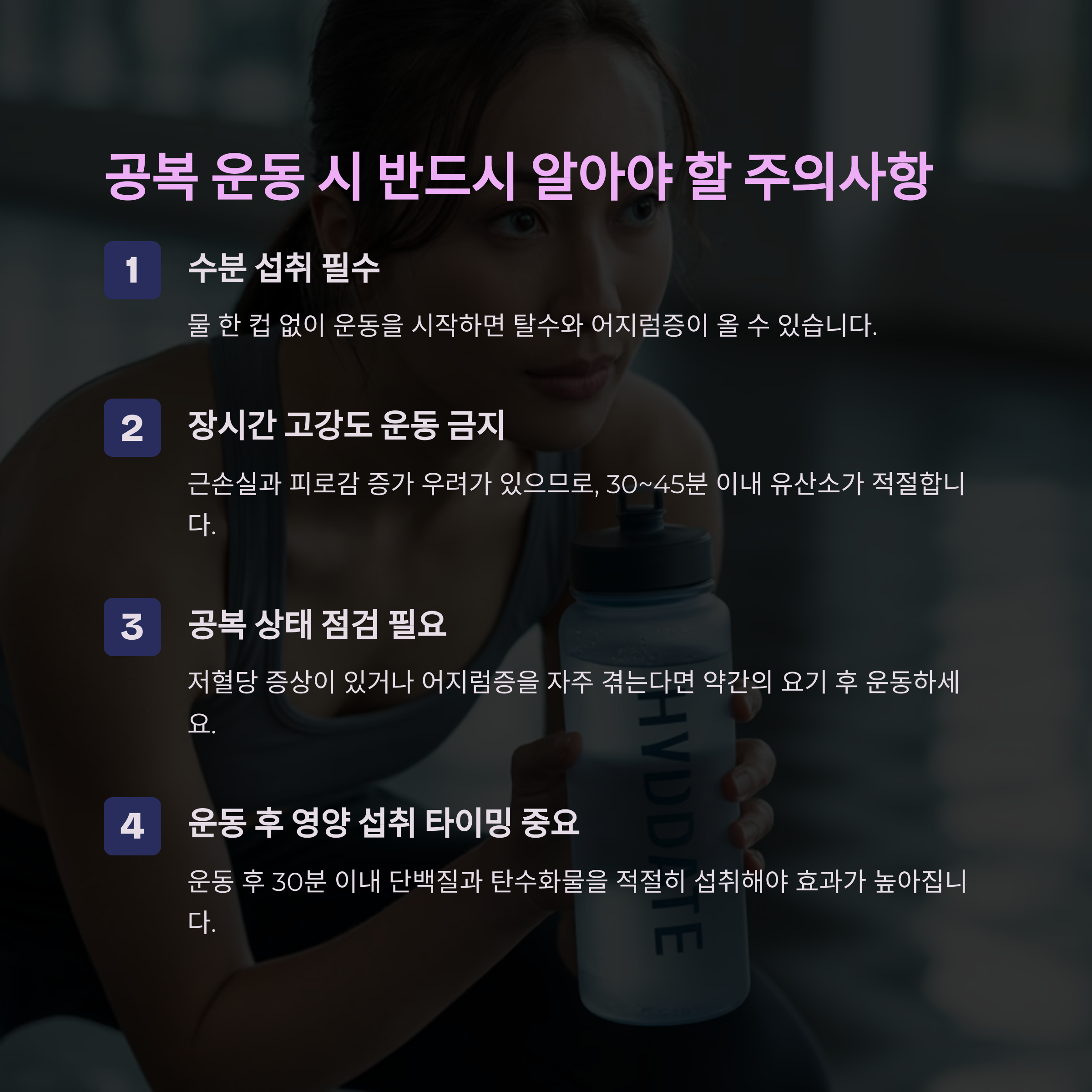 물 한 컵 없이 운동을 시작하면 탈수와 어지럼증이 올 수 있습니다. - 장시간 고강도 운동 금지