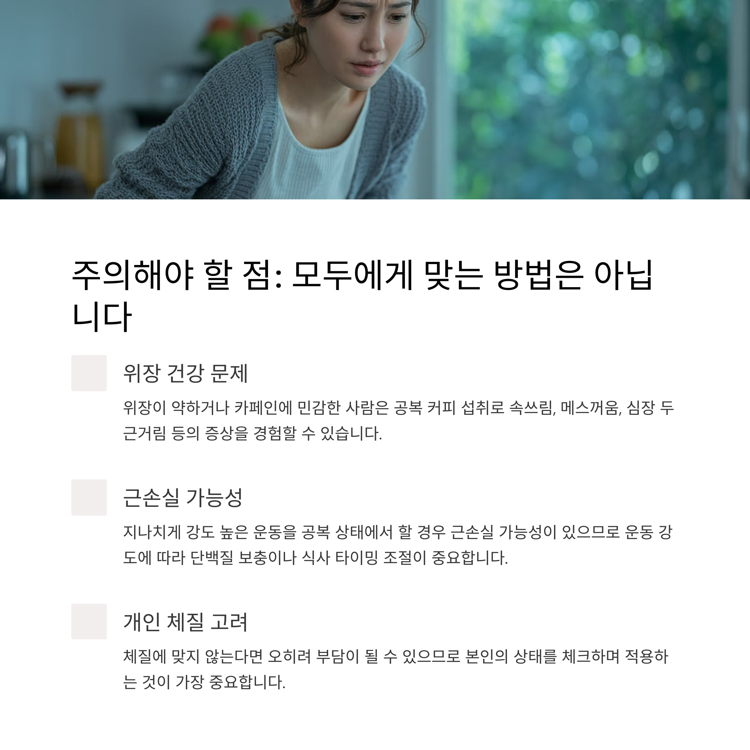 공복 커피 섭취로 속쓰림, 메스꺼움, 심장 두근거림 등의