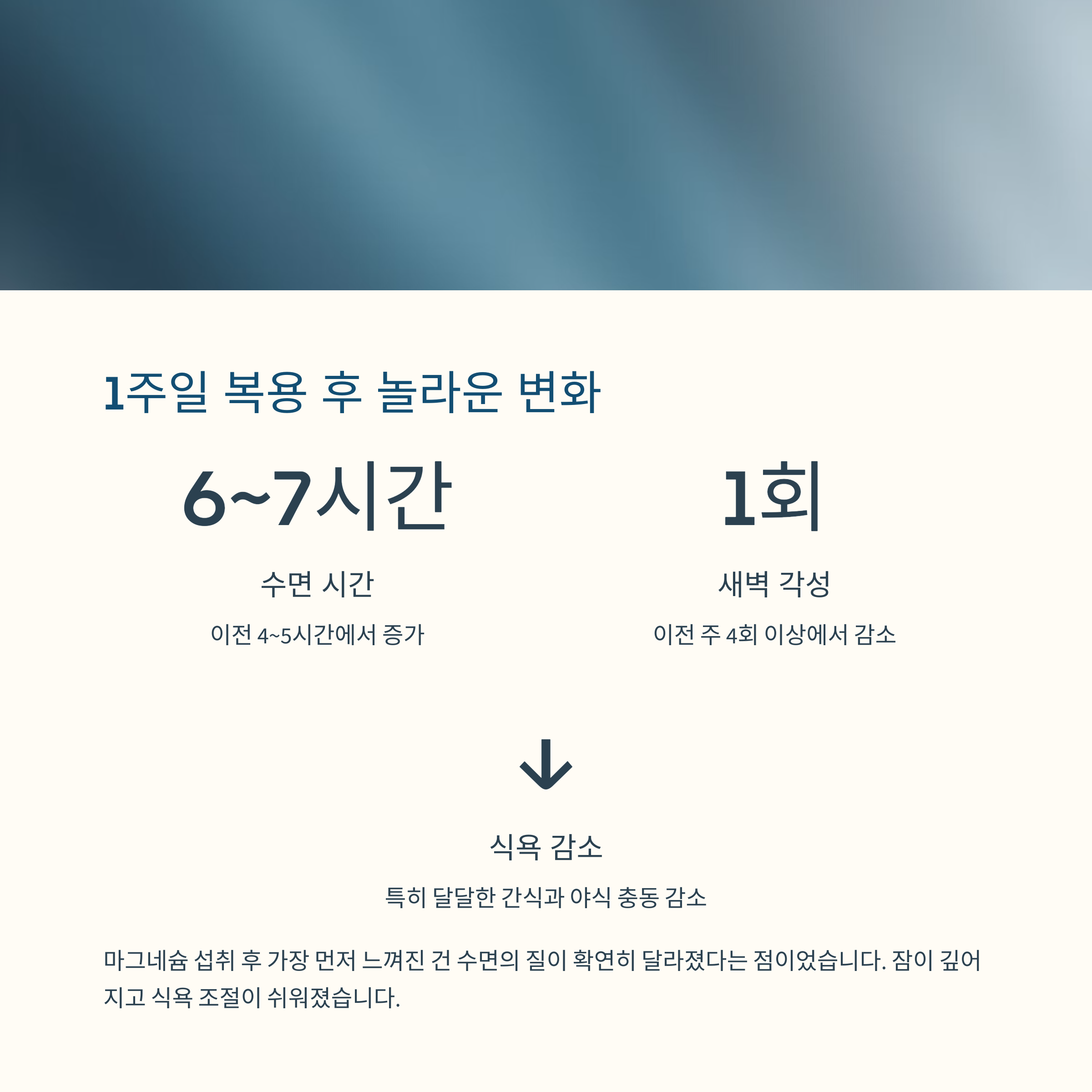 복용 전후 생활 습관은 거의 동일했기에, 마그네슘이 간접적으로 체중 조절에 긍정적인 영향을 준 것은 확실했습니다. 운동 후 회복이 빨라지며 활동량이 늘고, 수면이 깊어지면서 대사 기능이 개선된 결과였습니다.