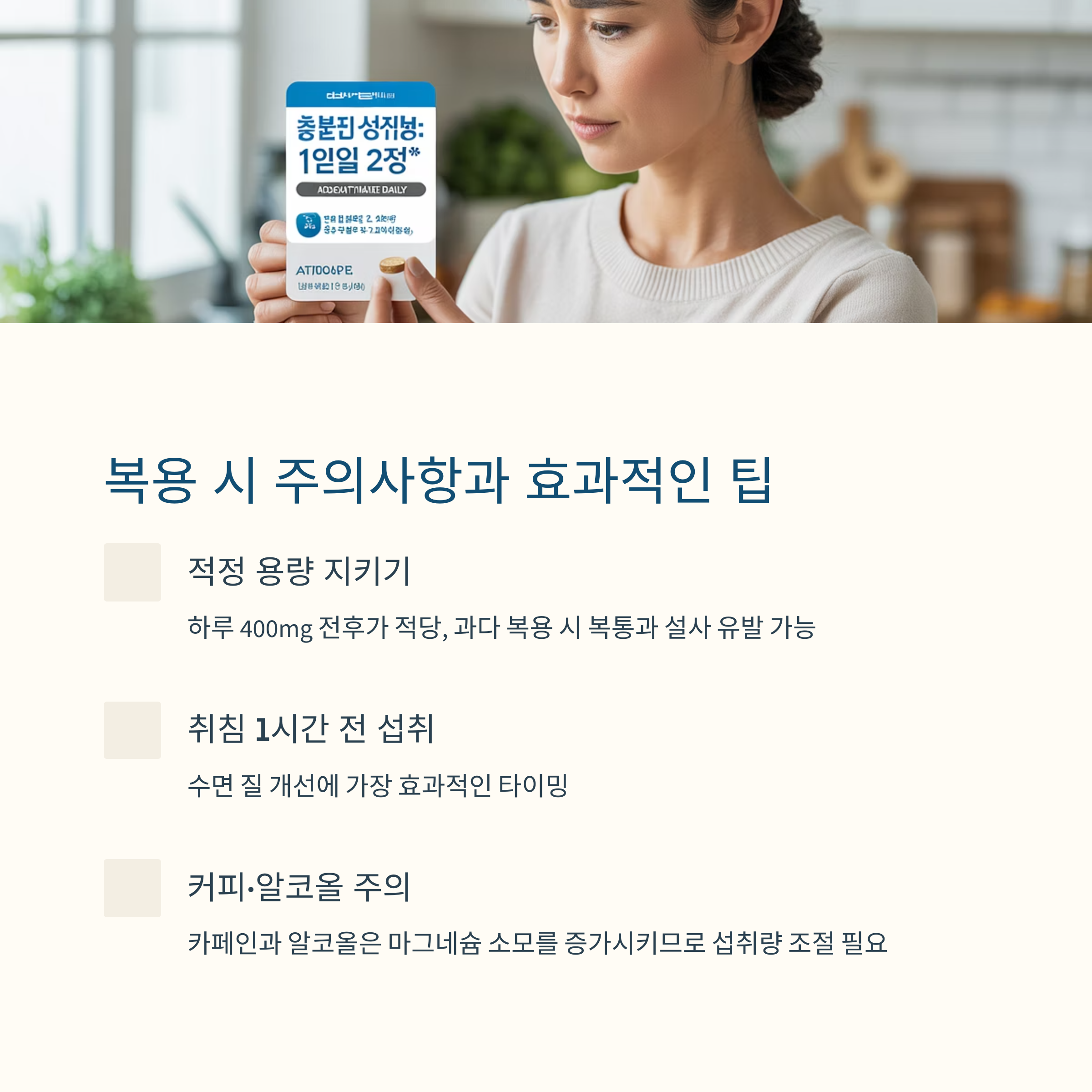 제품 자체는 안전성이 높지만, 마그네슘 역시 과다 복용 시 복통, 설사 등을 유발할 수 있습니다. 하루 섭취량은 400mg 전후가 적당하며, 취침 전에 섭취하는 것이 가장 효과적입니다. 다음은 실천에 도움이 되었던 팁입니다.
