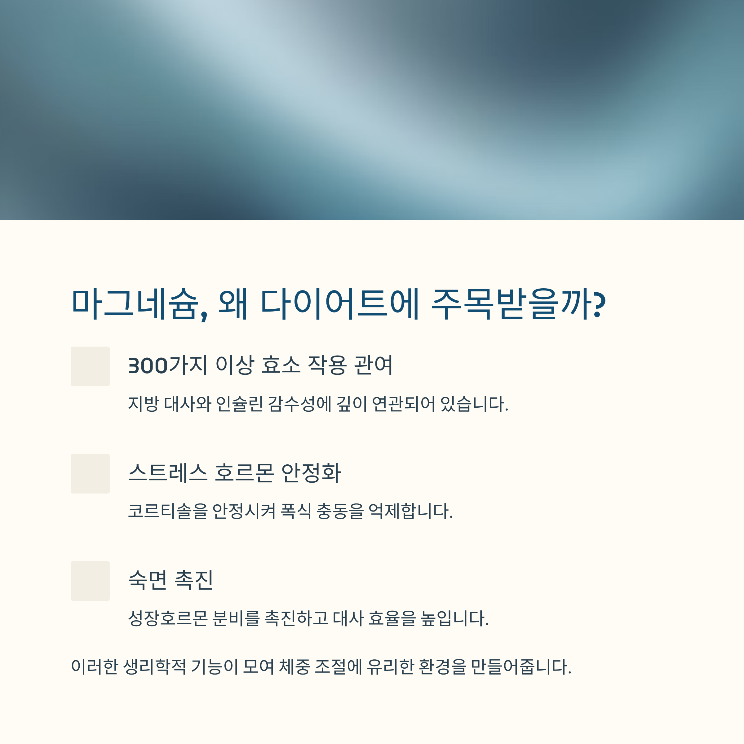 마그네슘은 인체의 300가지 이상의 효소 작용에 관여하며, 지방 대사와 인슐린 감수성에도 깊이 연관되어 있습니다. 특히 스트레스 호르몬인 ‘코르티솔’을 안정시켜 폭식 충동을 억제하고, 숙면을 통해 성장호르몬 분비를 촉진하는 데도 역할을 합니다.