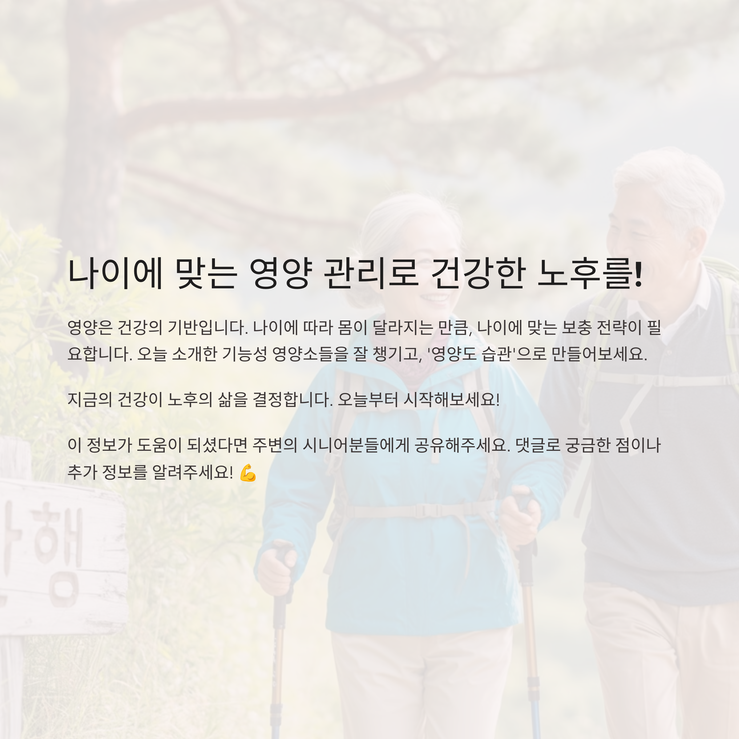 영양은 건강의 기반입니다. 나이에 따라 몸이 달라지는 만큼, 나이에 맞는 보충 전략이 필요합니다. 오늘 소개한 기능성 영양소들을 잘 챙기고, ‘영양도 습관’으로 만들어보세요. 지금의 건강이 노후의 삶을 결정합니다.