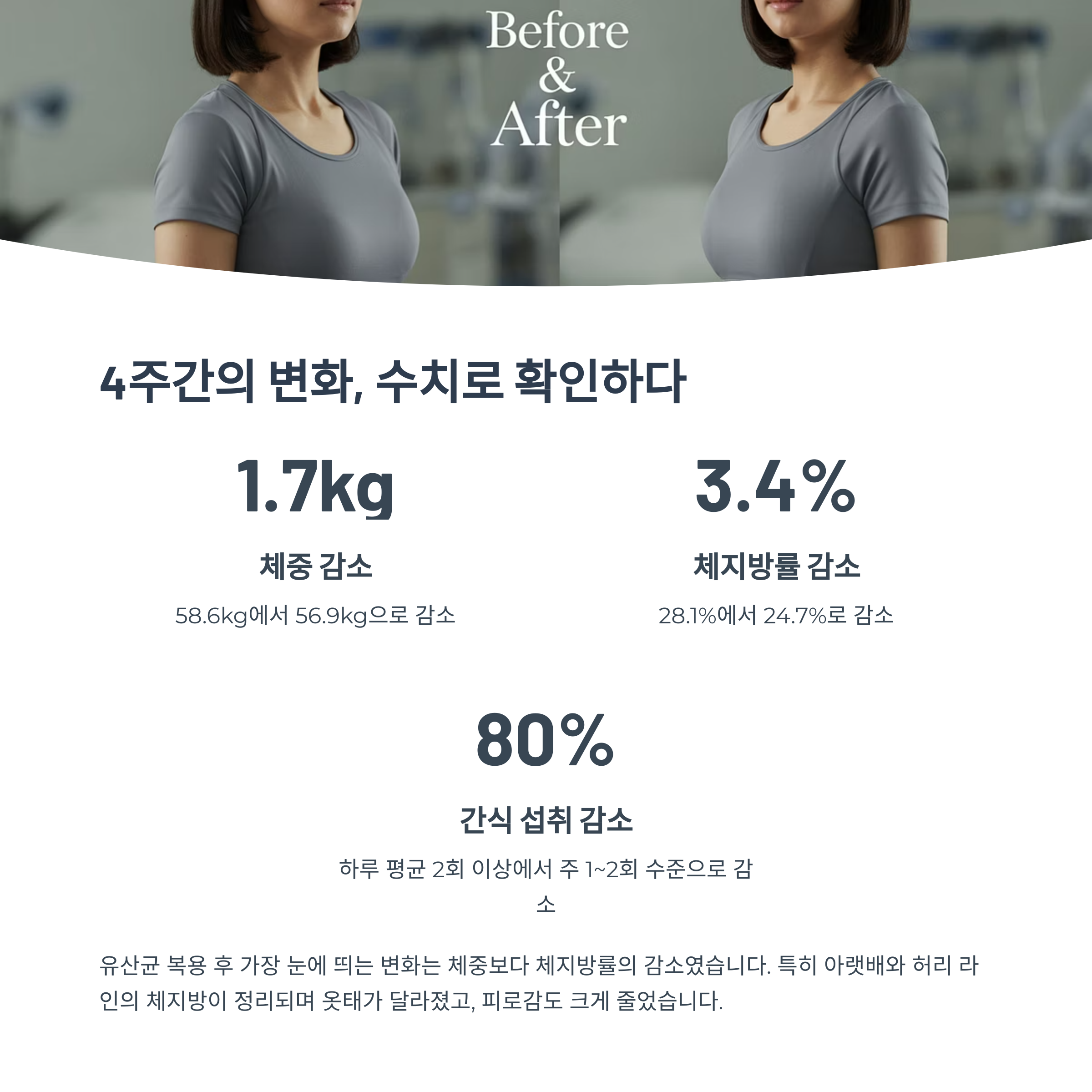 유산균만으로 급격한 감량은 어렵지만, 확실히 몸의 ‘다이어트 모드’를 자연스럽게 유도하는 역할을 한다는 점에서 의미가 있었습니다. 특히 아랫배와 허리 라인의 체지방이 정리되며 옷태가 달라졌고, 피로감이 줄어든 것도 인상적이었습니다.