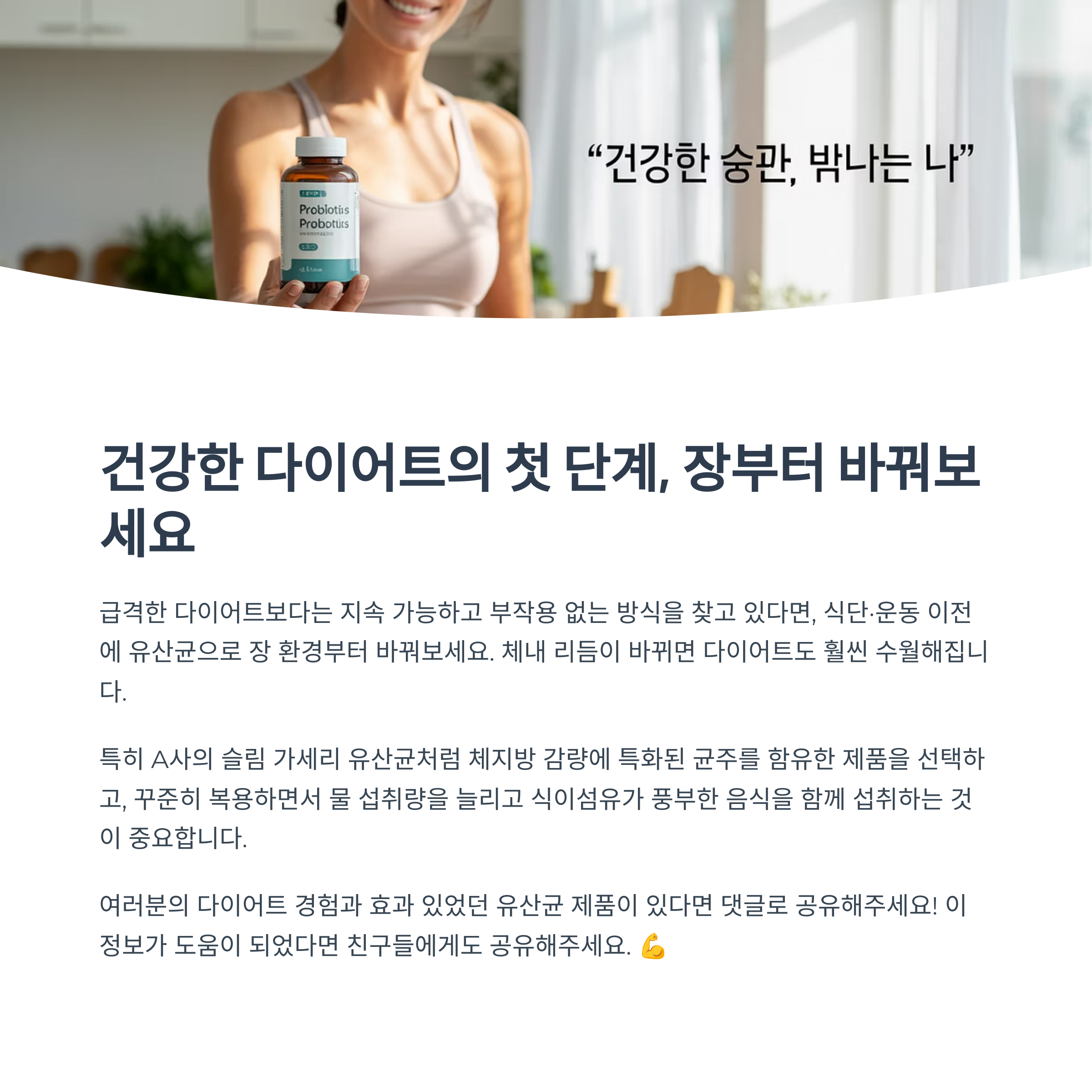 급격한 다이어트보다는 ‘지속 가능하고 부작용 없는 방식’을 찾고 있다면, 식단·운동 이전에 유산균으로 장 환경부터 바꿔보는 것을 추천드립니다. 체내 리듬이 바뀌면 다이어트도 훨씬 수월해진다는 것을 직접 체감했습니다.