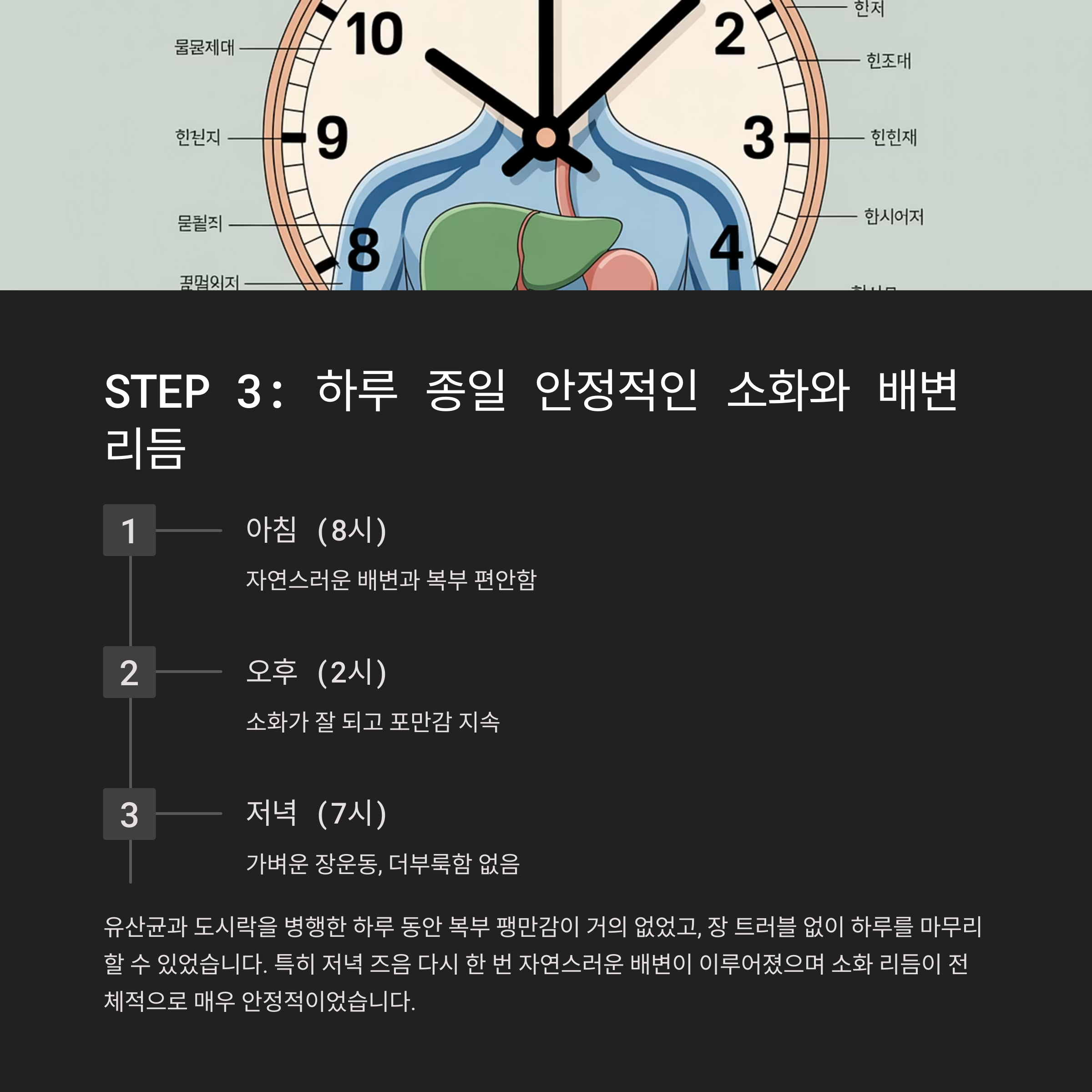 | 저녁 (7시) | 가벼운 장운동 | 배가 더부룩하지 않음 |