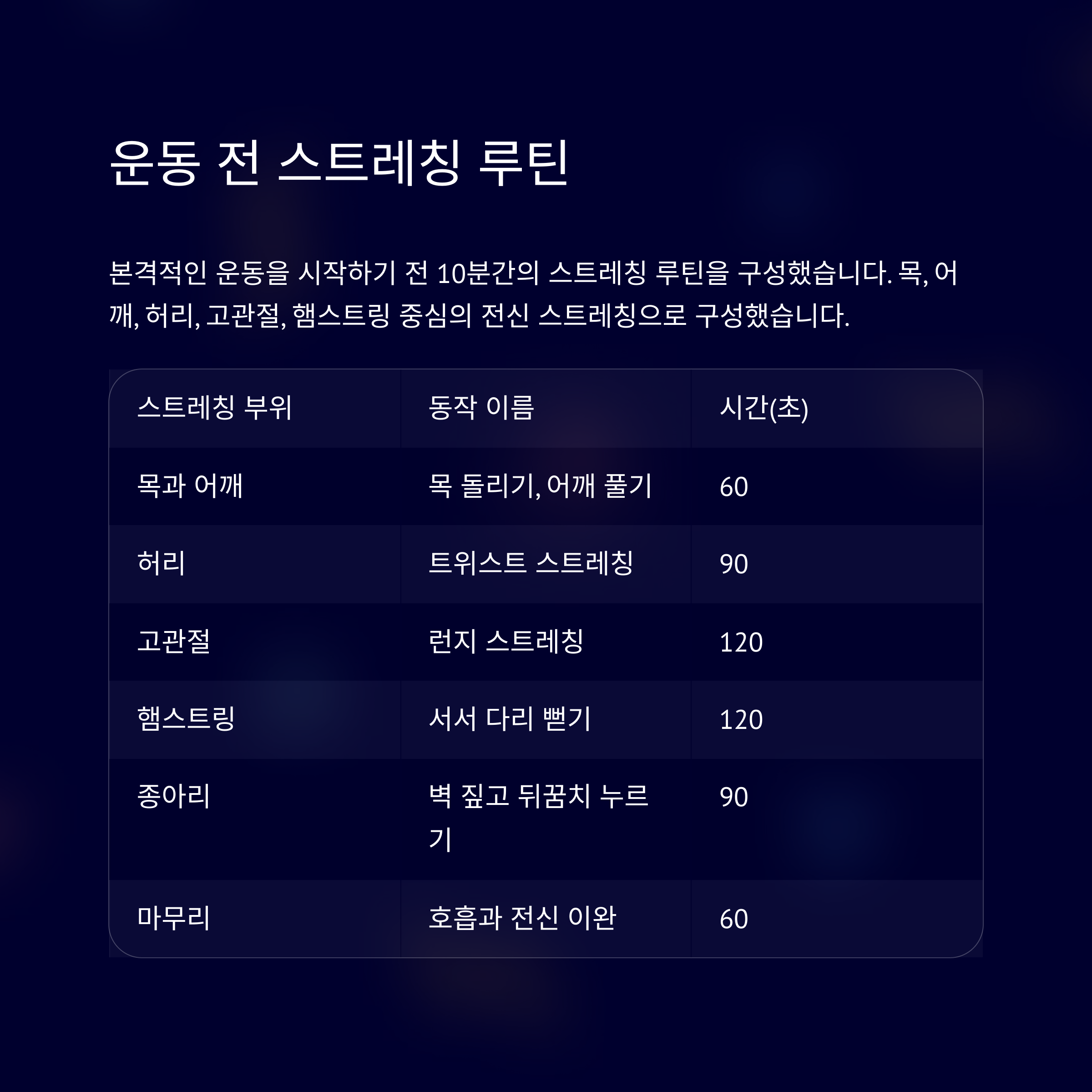 본격적인 운동을 시작하기 전 스트레칭 루틴을 구성했습니다.