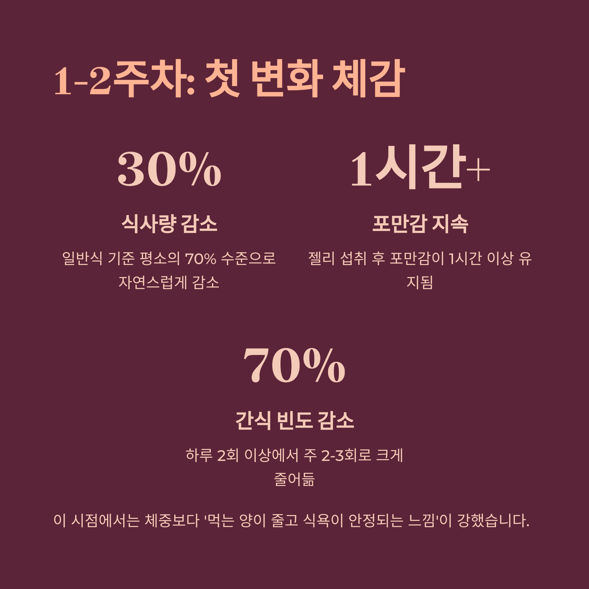 또한 젤리 섭취를 하지 않던 시절과 비교하면 식욕 통제에 대한 불안이 줄어들었고, 야식 욕구나 스트레스성 폭식도 거의 사라졌습니다. 포만감이 유지되니 자연스럽게 식단에 대한 죄책감도 줄었습니다.