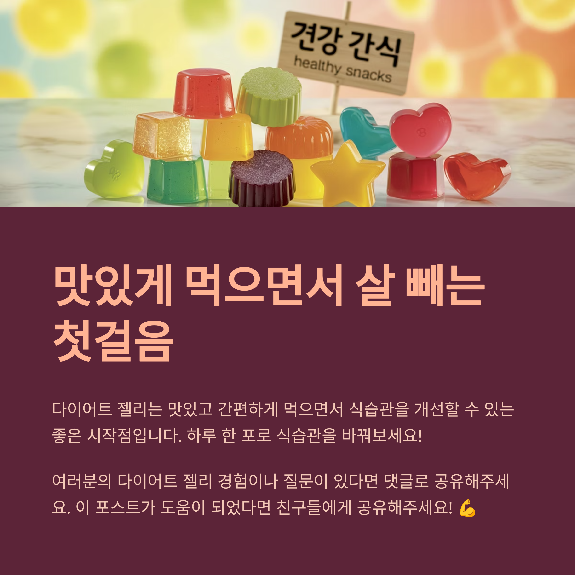 결국 다이어트 젤리는 ‘이걸로 살을 뺀다’는 개념이 아니라, 나도 모르게 먹던 식습관을 개선해주는 연결 도구로서의 역할이 확실히 존재합니다. 맛있고 간편하게 먹으면서 감량을 시작하고 싶다면, 젤리 한 포로 하루 습관을 바꿔보는 건 충분히 해볼 만한 선택입니다.