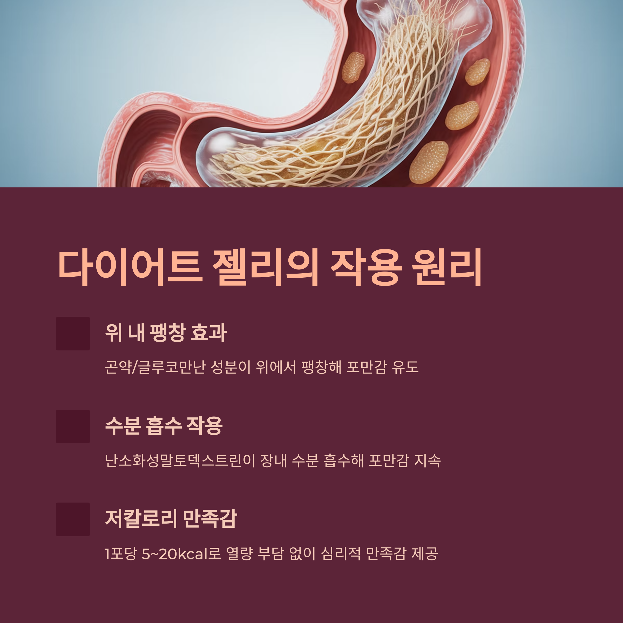 | 포만감 지속 시간 | 식후 2~3시간 뒤 배고픔 발생 | 젤리 섭취 시 3~4시간 유지됨 |