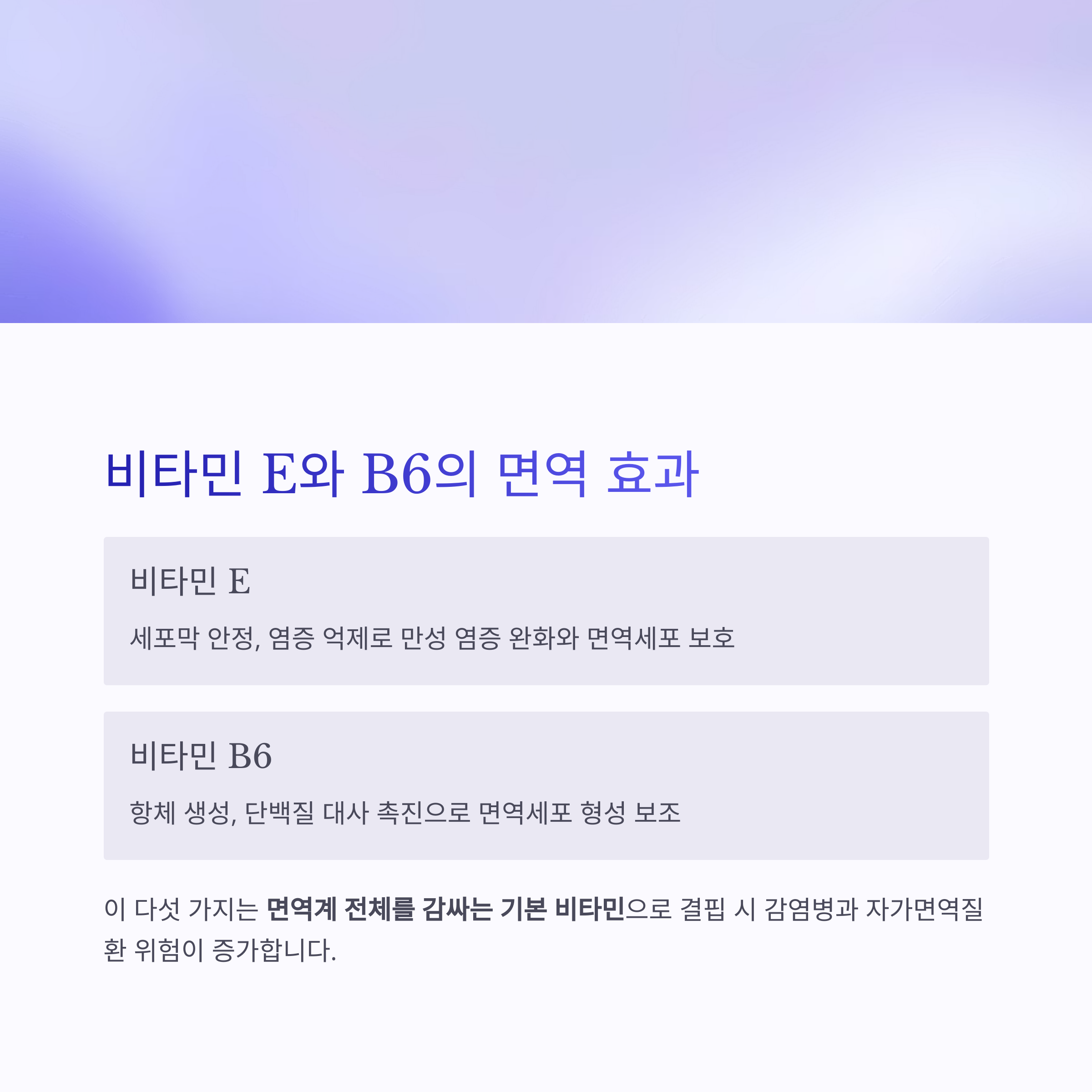 | 비타민 B6 | 항체 생성, 단백질 대사 | 면역세포 형성 보조, 피로 회복 |