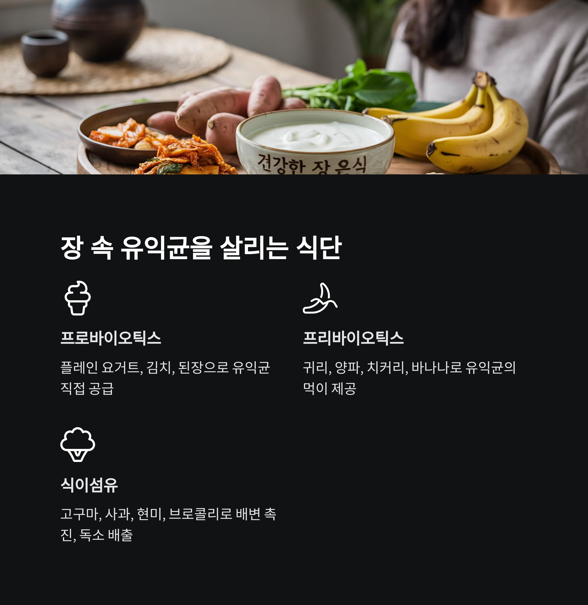 | 프로바이오틱스 | 유익균 직접 공급 | 플레인 요거트, 김치, 된장 |