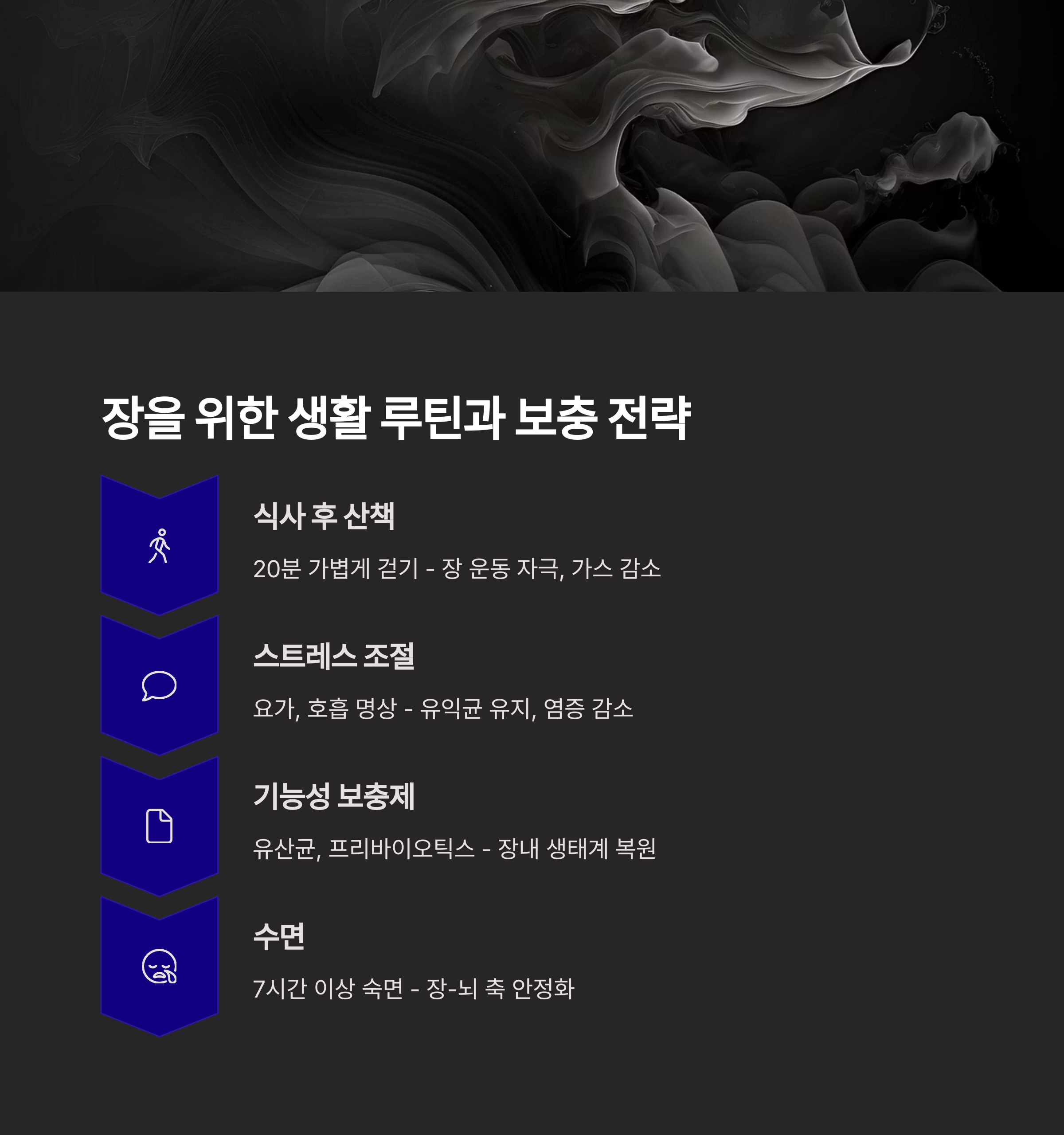 | 수면 | 7시간 이상 숙면 | 장-뇌 축 안정화 |