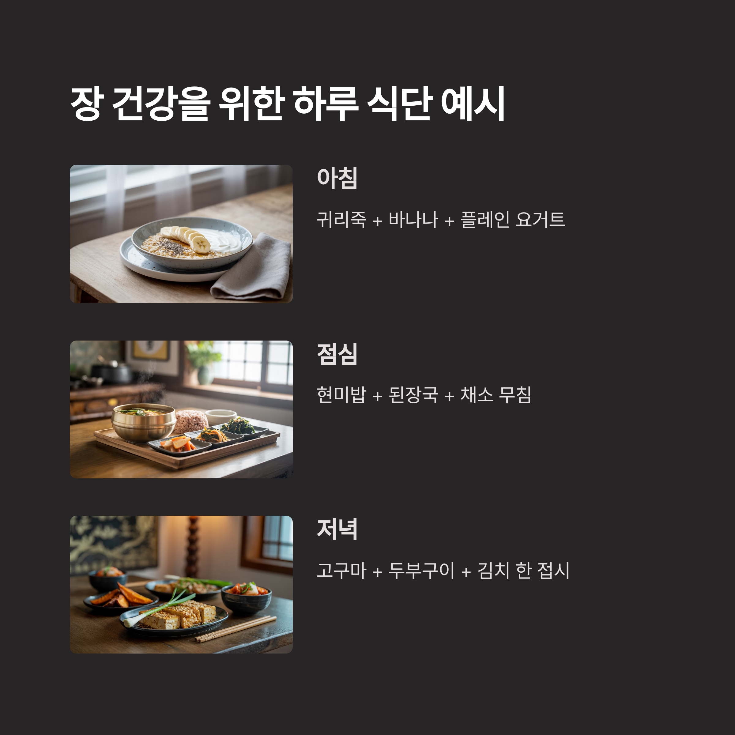 다음은 장 건강 루틴을 위한 하루 식단 예시입니다
