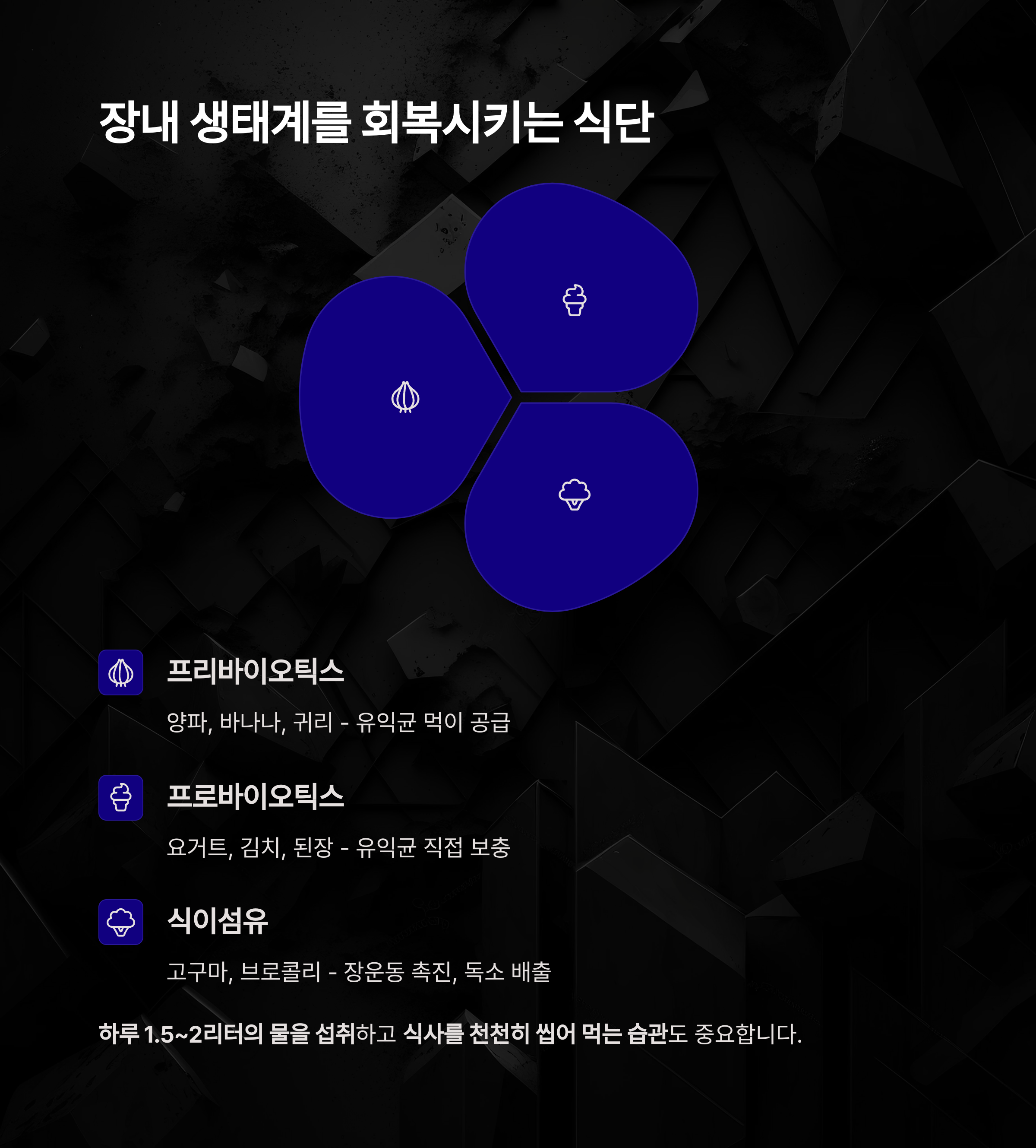 이를 위해 프리바이오틱스, 프로바이오틱스, 그리고 식이섬유가 조화된 식단 구성이 중요합니다