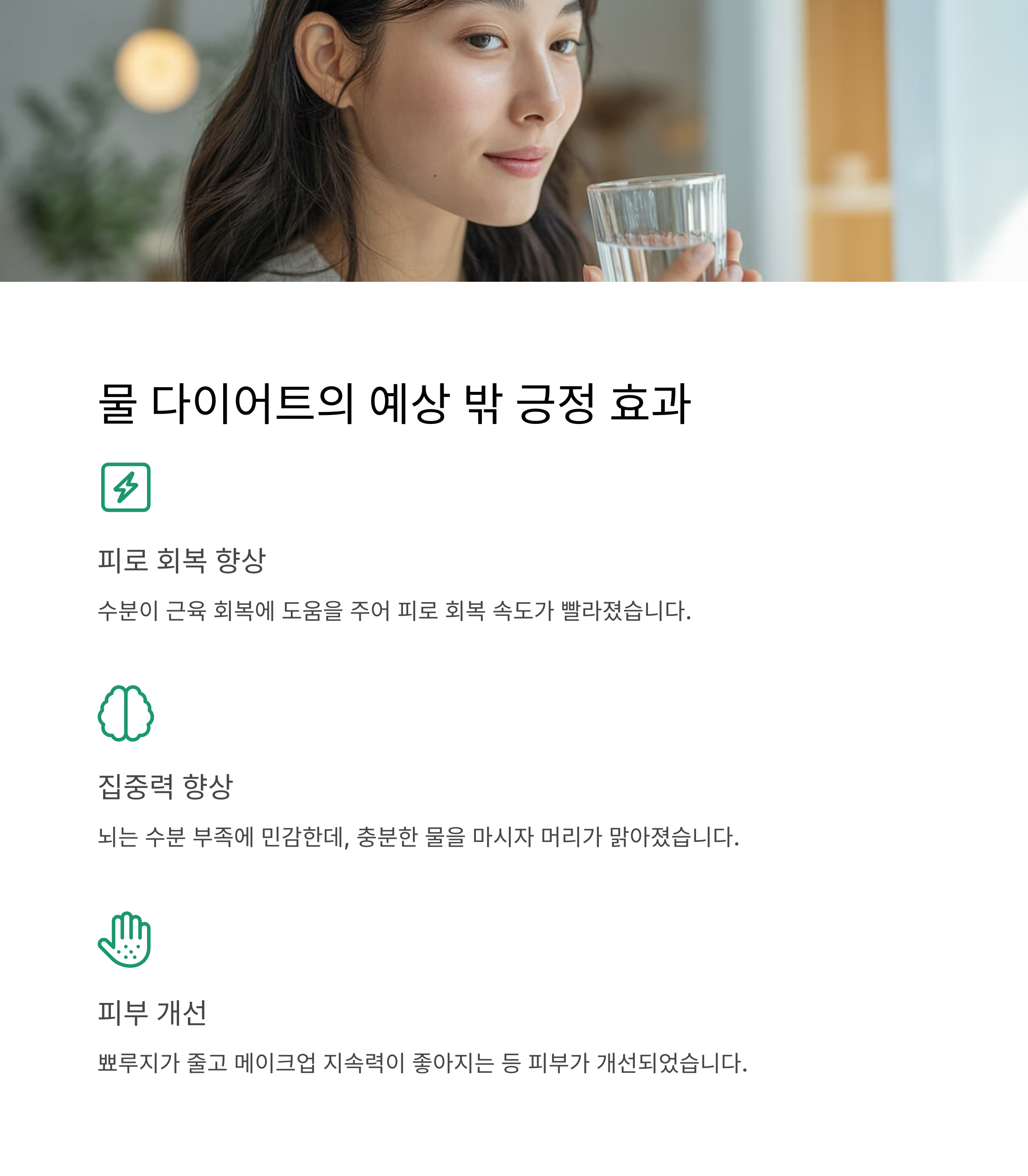 첫째, 물이 체내 대사율을 높여 에너지 소비량을 증가시켰습니다. 둘째, 충분한 수분 섭취로 인해 부종이 빠지며 실제 몸이 가벼워졌습니다. 셋째, 수분 중심의 생활은 건강한 식습관까지 이어졌습니다.