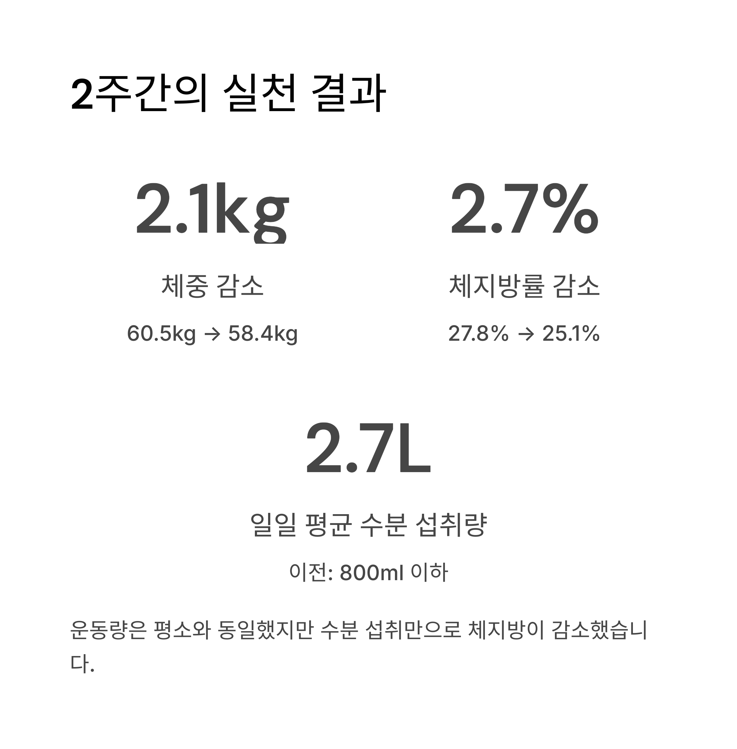 2주간 하루 2.5~3L의 물을 마시고, 간식을 줄이는 패턴을 유지한 결과 체중은 총 2.1kg 감소했습니다. 운동은 평소보다 많이 하지 않았음에도 불구하고 수분 섭취만으로 체지방이 줄어든 것을 확인할 수 있었습니다. 그 이유는 다음과 같은 요소들 때문이라고 분석됩니다.