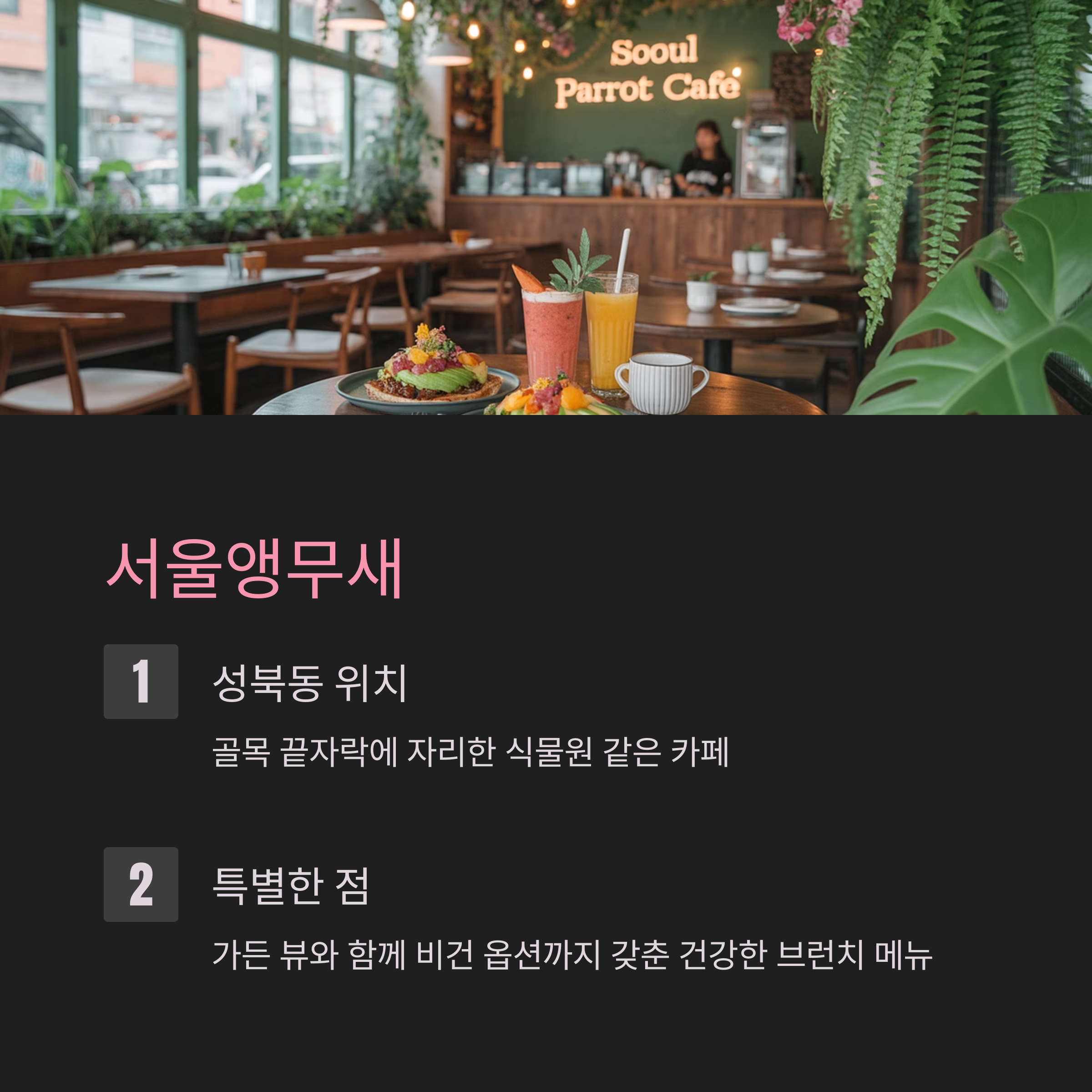 | 서울앵무새 | 성북동 | 비건 브런치, 샐러드 | 식물 가득한 채광 공간 |