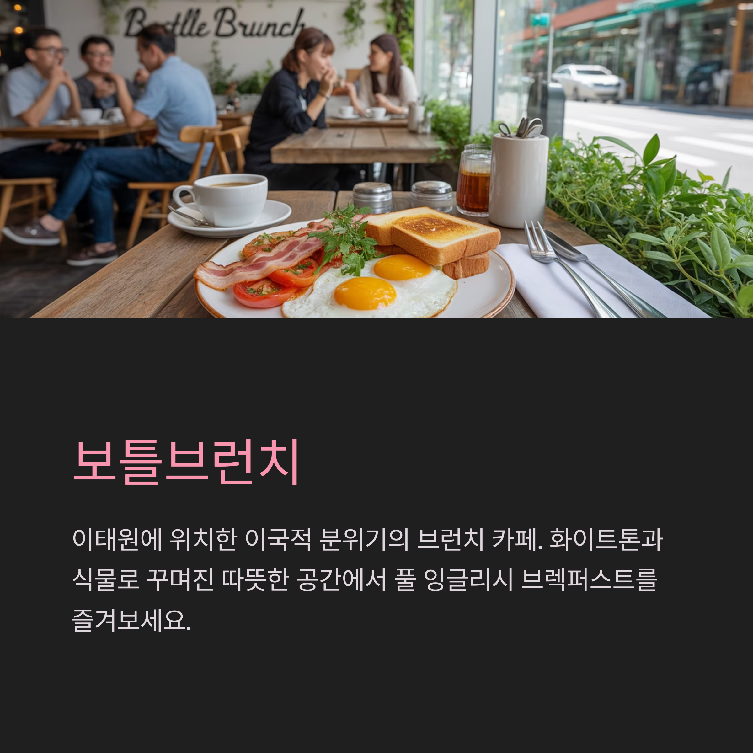 | 보틀브런치 | 이태원 | 잉글리시브랙퍼스트 | 이국적, 따뜻한 무드 |