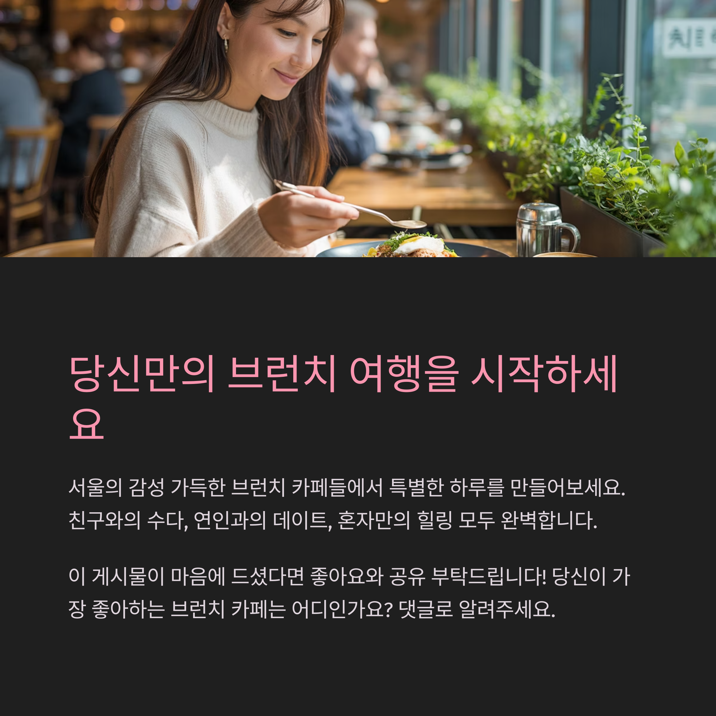 바쁜 일상 속에서 잠깐의 여유를 느끼고 싶을 때, 감성 가득한 브런치 카페는 최고의 쉼터가 되어줍니다. 특히 서울 곳곳에는 음식 맛뿐 아니라 인테리어, 채광, 음악까지 모든 요소가 조화를 이루는 브런치 명소들이 많습니다. 이번 글에서는 분위기 좋기로 입소문난 브런치 카페 7곳을 소개합니다. 친구와 수다 타임, 연인과의 데이트, 혼자만의 힐링 모두 어울리는 공간으로 구성했습니다.