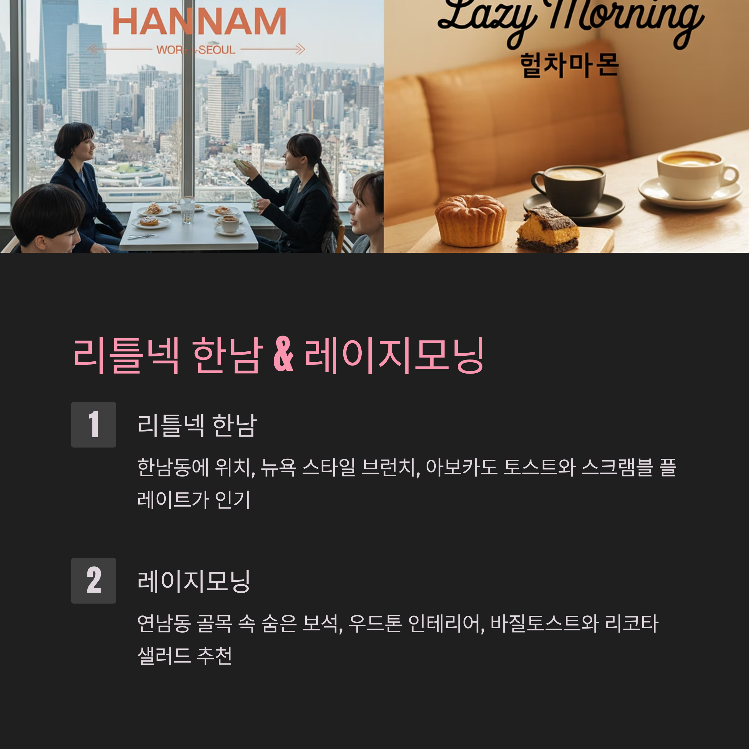 | 리틀넥 한남 | 한남동 | 아보카도토스트, 브런치플레이트 | 세련된 뉴욕 감성 |