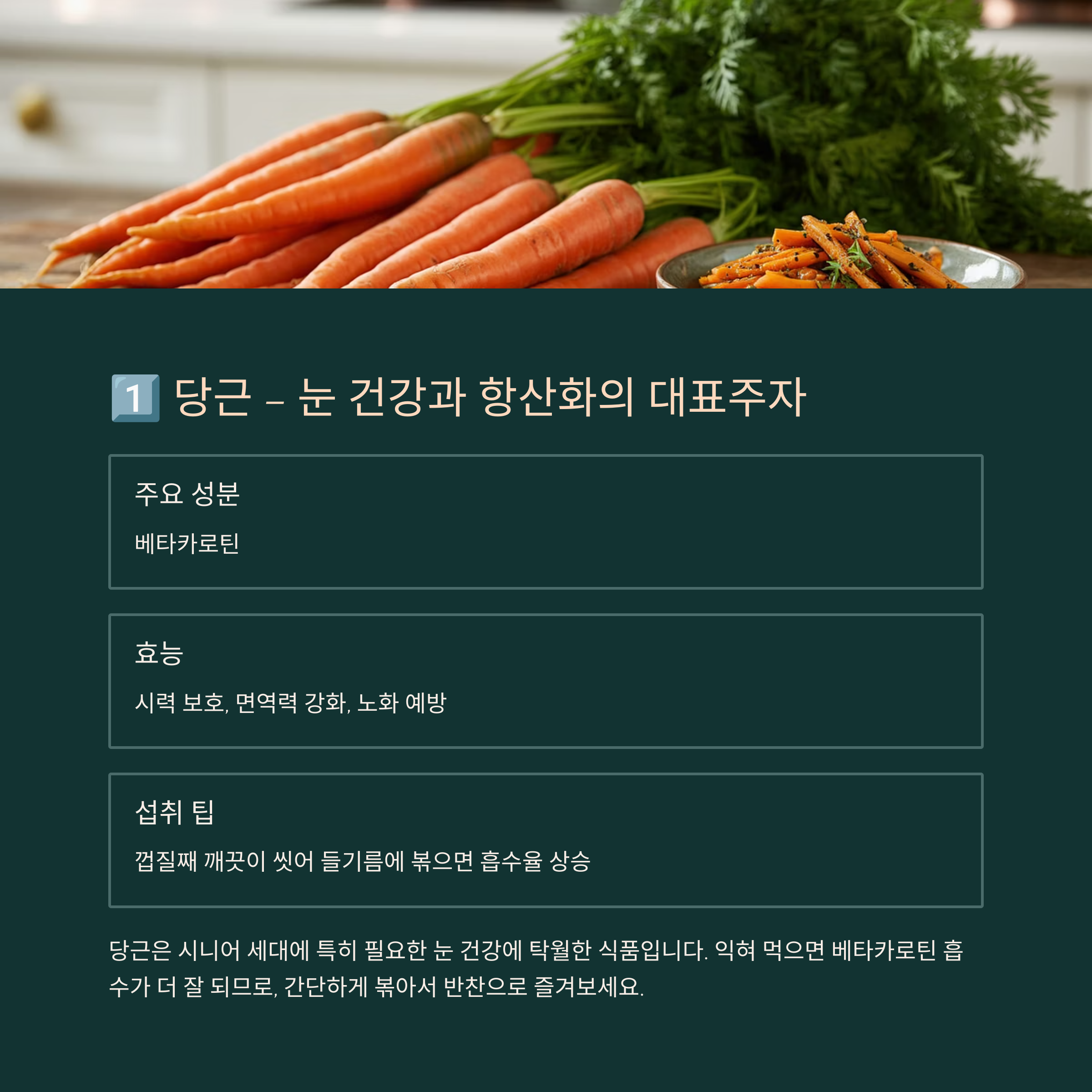당근은 시니어 세대에 특히 필요한 눈 건강에 탁월한 식품입니다. 익혀 먹으면 베타카로틴 흡수가 더 잘 되므로, 간단하게 볶아서 반찬으로 즐겨보세요.