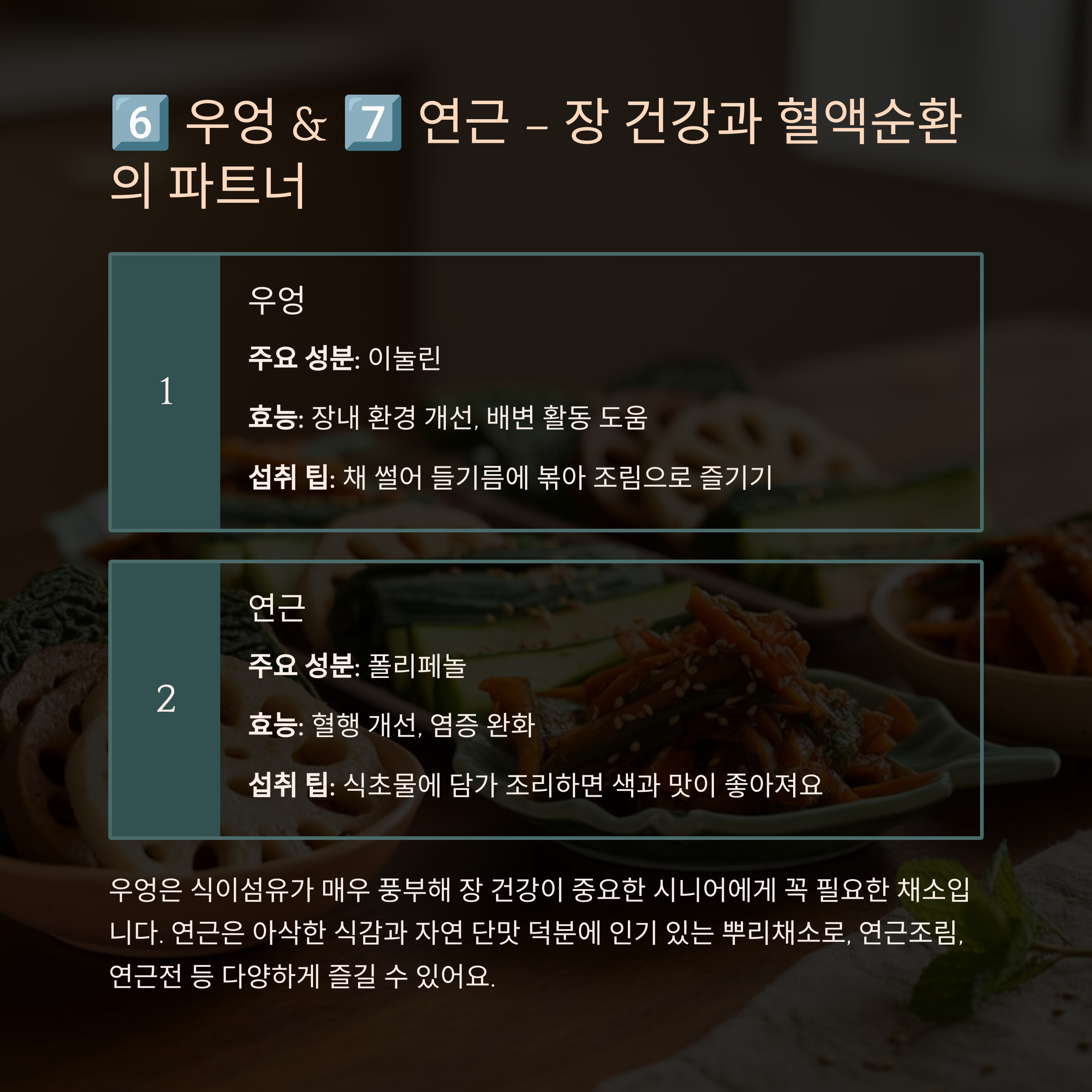 우엉은 식이섬유가 매우 풍부해 장 건강이 중요한 시니어에게 꼭 필요한 채소입니다. 조림이나 볶음으로 꾸준히 섭취해보세요.