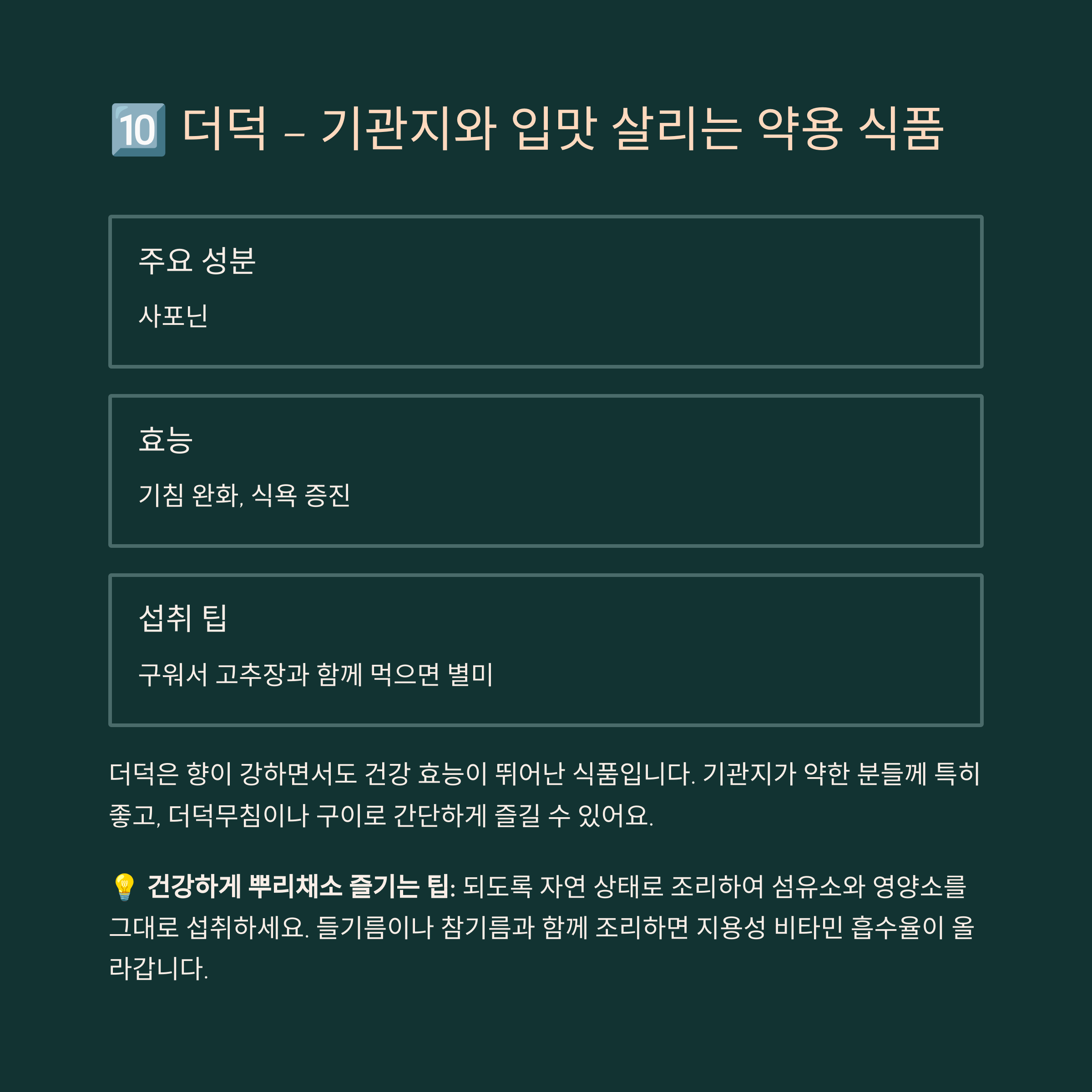 더덕은 향이 강하면서도 건강 효능이 뛰어난 식품입니다. 기관지가 약한 분들께 특히 좋고, 더덕무침이나 구이로 간단하게 즐길 수 있어요.