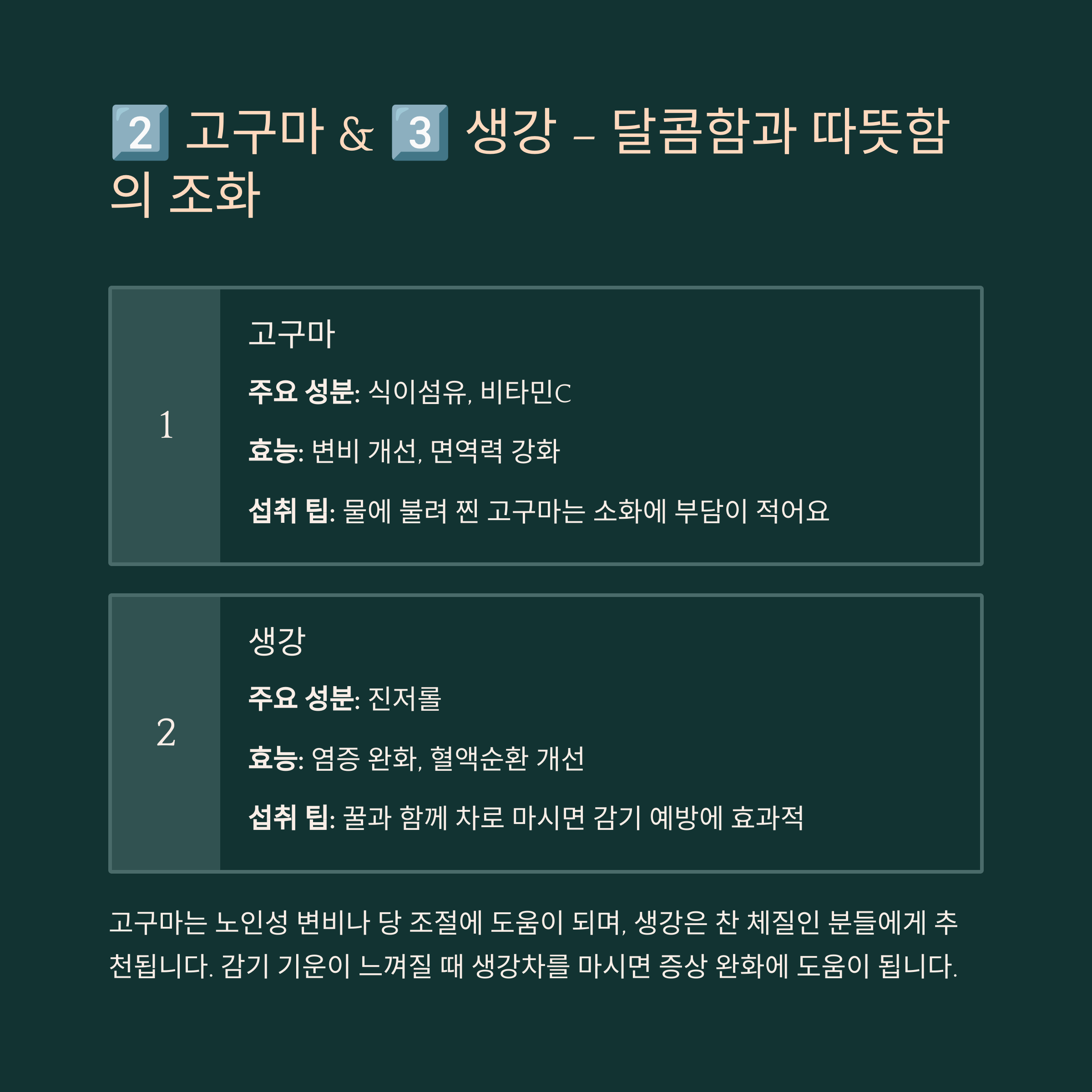 고구마는 맛과 영양을 모두 갖춘 뿌리채소입니다. 노인성 변비나 당 조절에 도움이 되며, 군고구마나 찐고구마로 활용하면 간식 대용으로도 훌륭하죠.