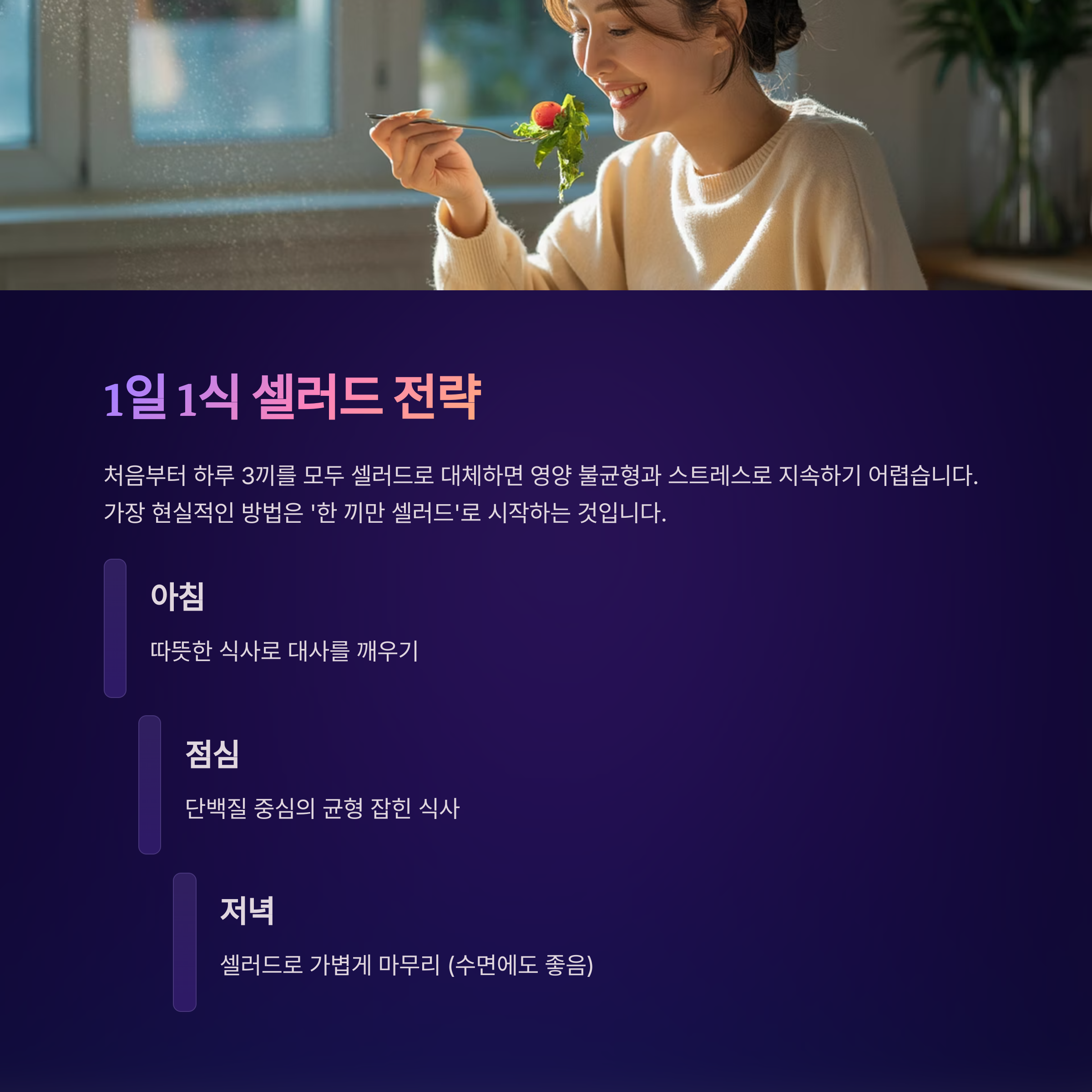 따라서 ‘한 끼만 셀러드’ 전략으로 접근하는 것이 가장 현실적입니다.