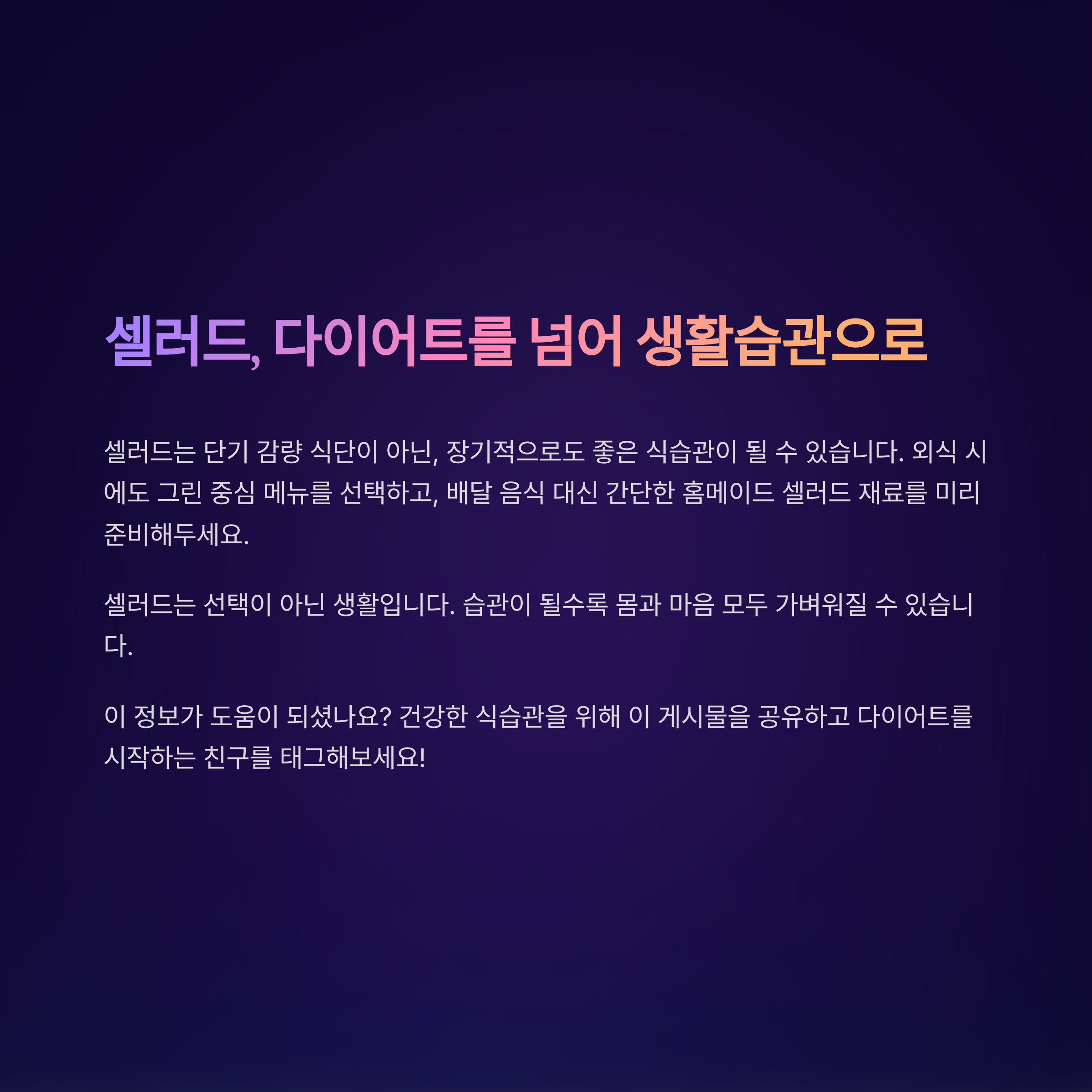 따라서 ‘한 끼만 셀러드’ 전략으로 접근하는 것이 가장 현실적입니다.