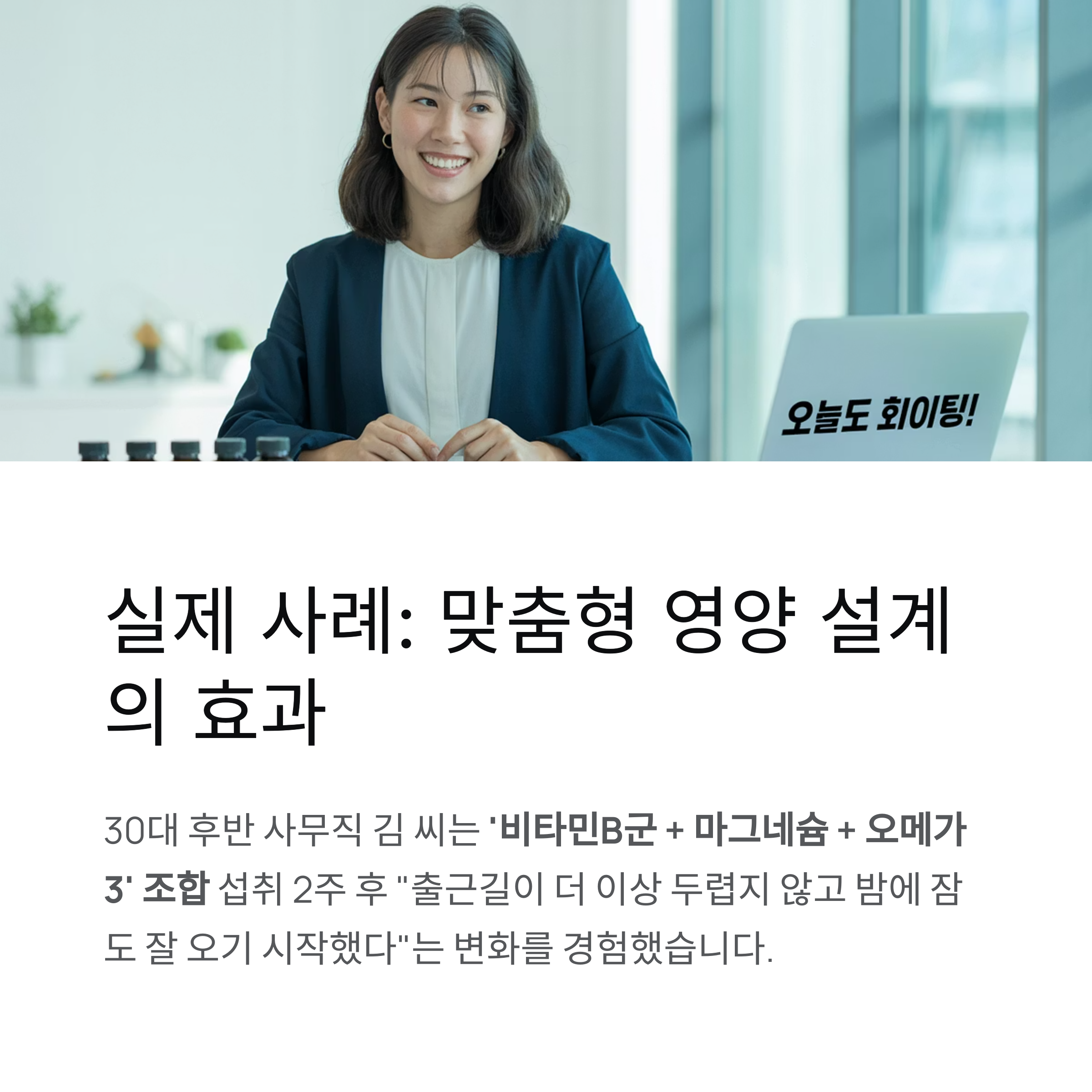 자신에게 맞는 영양 설계가 건강뿐 아니라 일상까지 바꾸었다고 말합니다