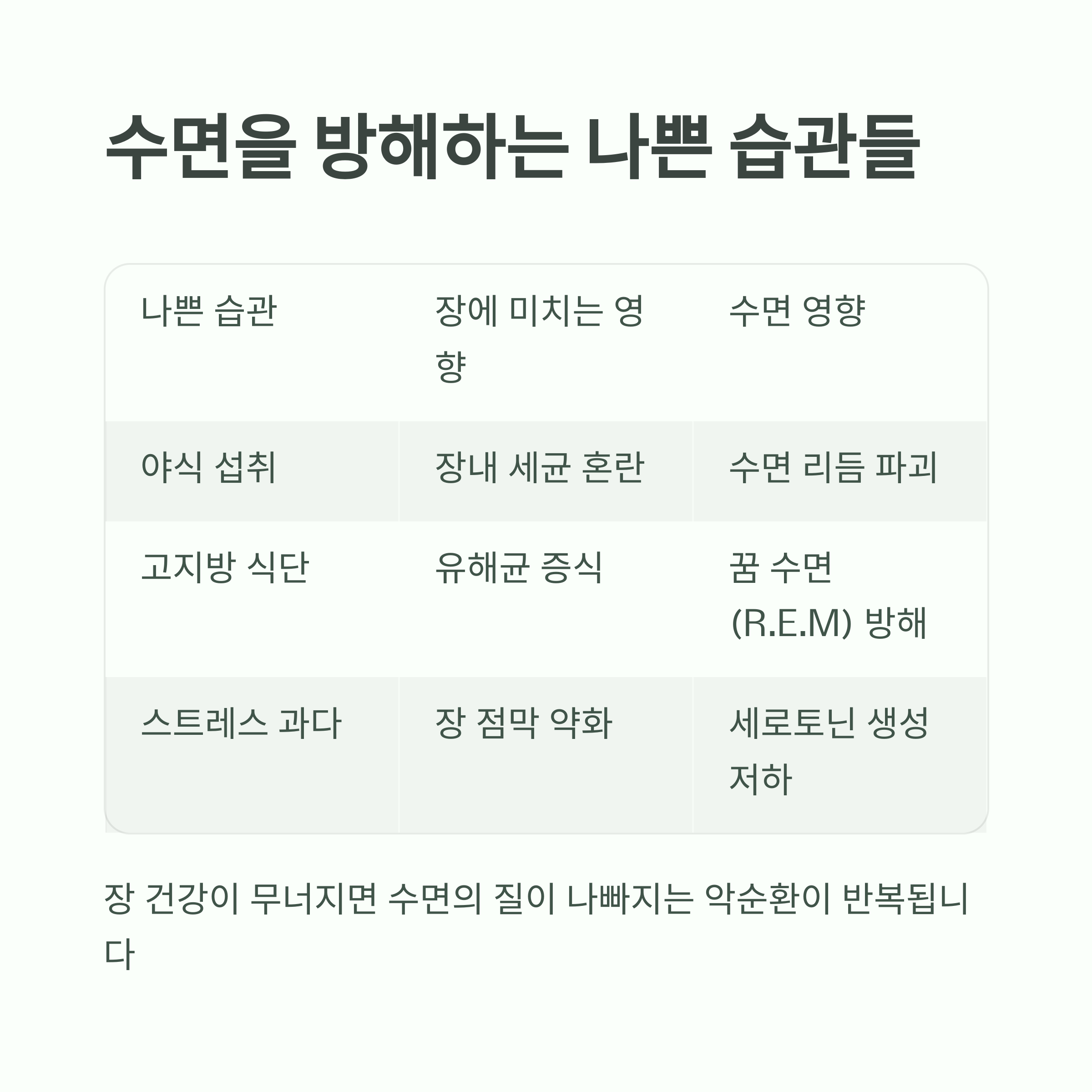 | 야식 섭취 | 장내 세균 혼란 | 수면 리듬 파괴 |