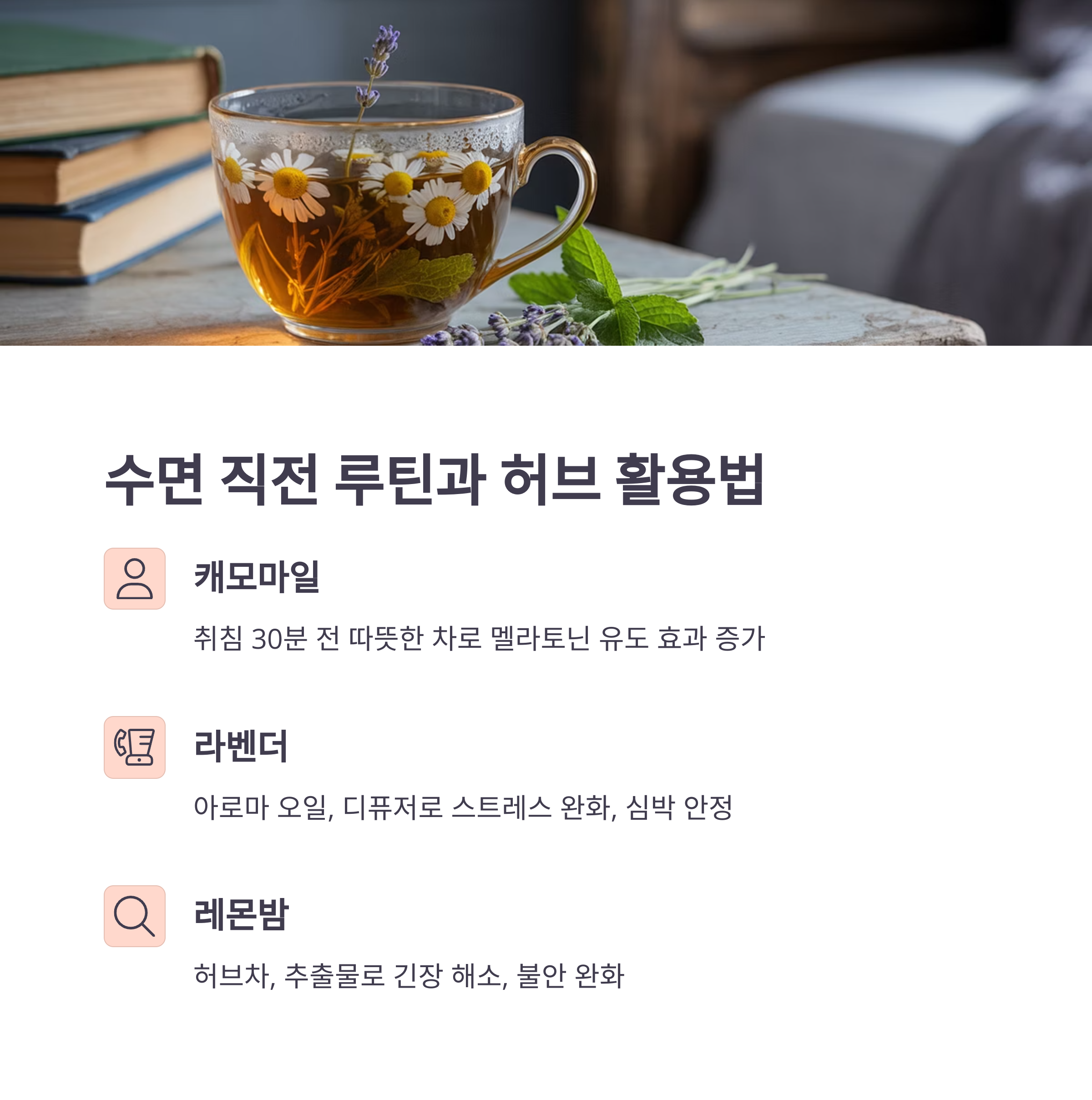 다음은 수면 루틴에 넣기 좋은 허브와 활용법입니다