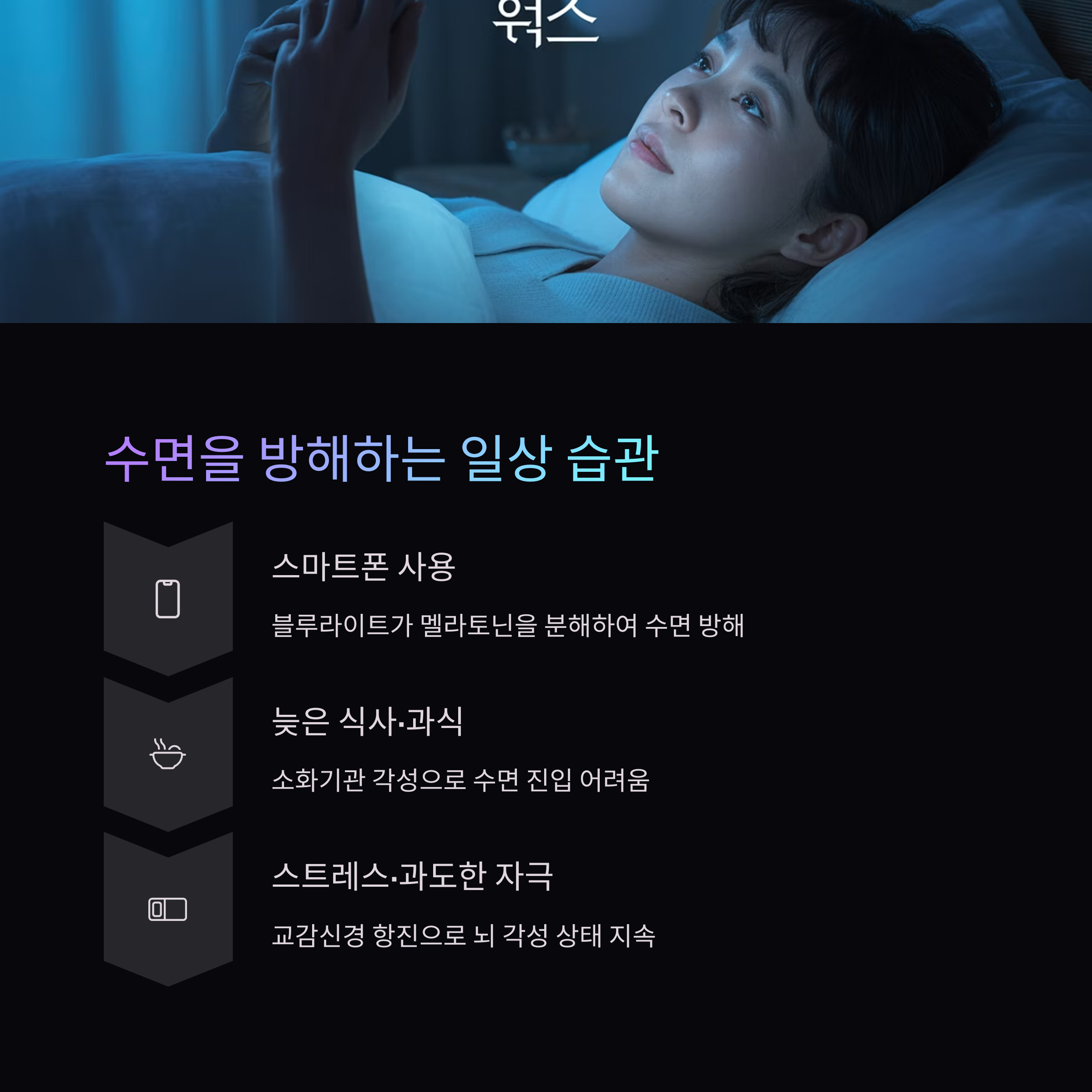 | 스마트폰 사용 | 블루라이트 → 멜라토닌 분해 | 취침 1시간 전 사용 중단 |