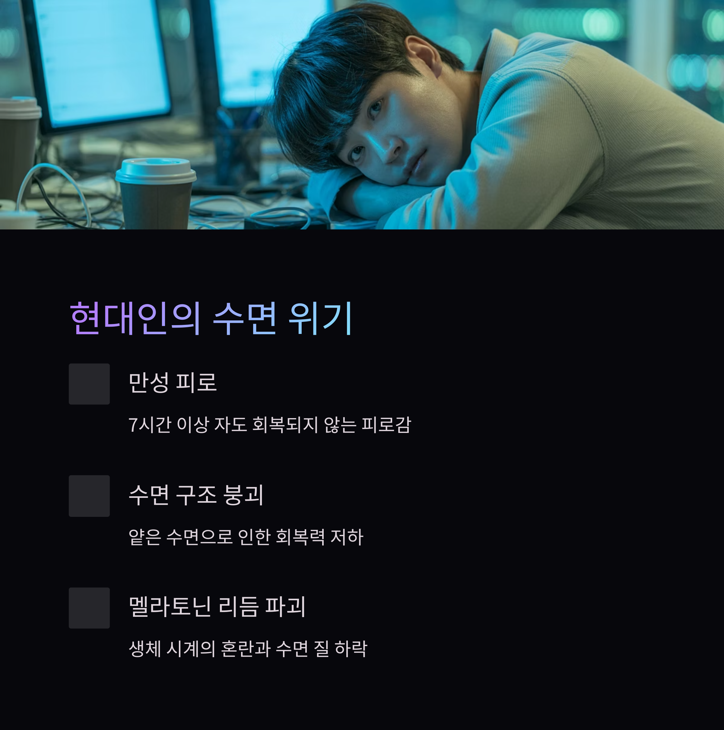 수면 질 저하로 인한 만성 피로, 정신적 불안, 신체 회복력 저하에 시달리고 있습니다