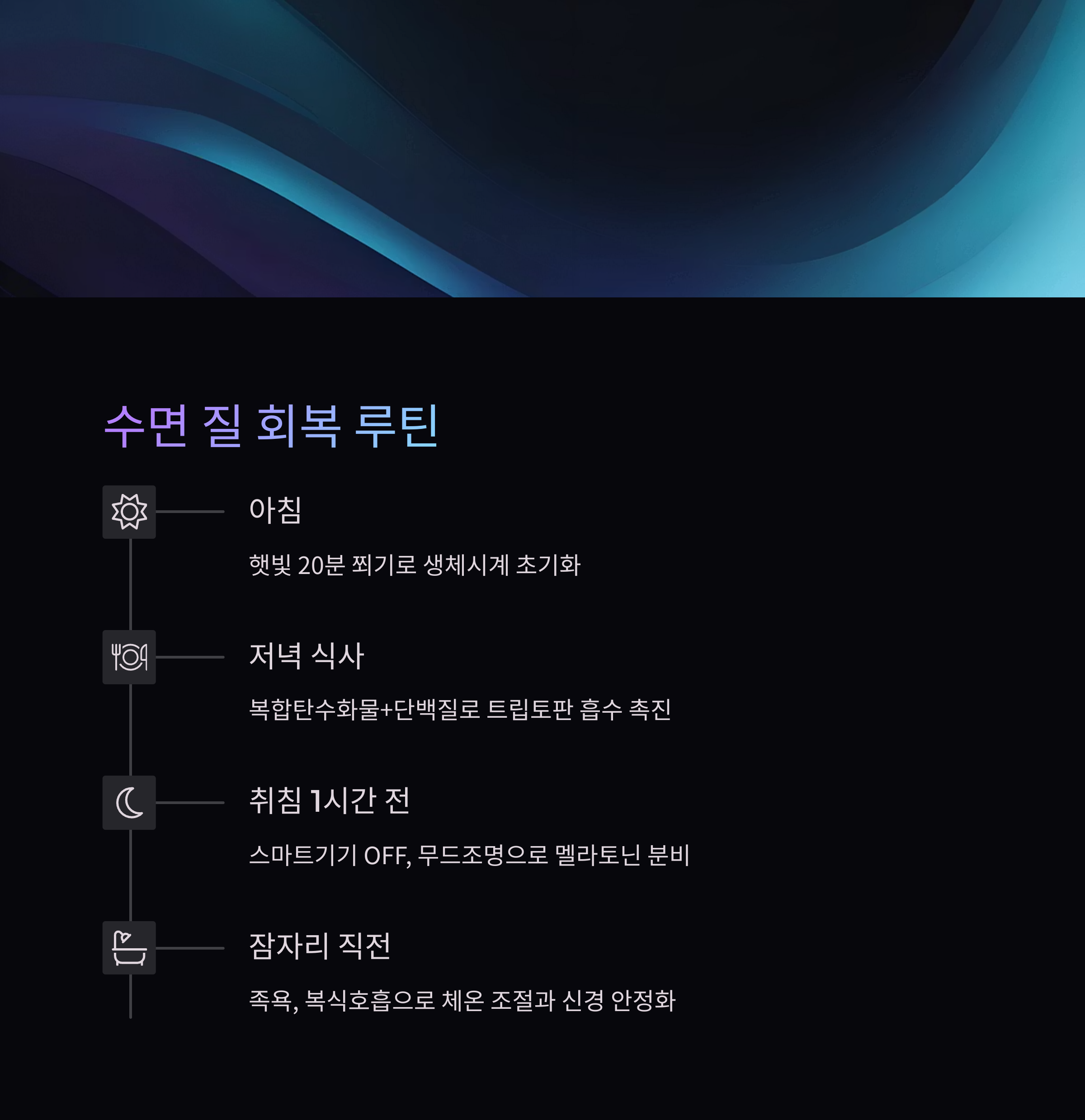 | 아침 | 오전 햇빛 20분 쬐기 | 생체시계 초기화, 멜라토닌 준비 |